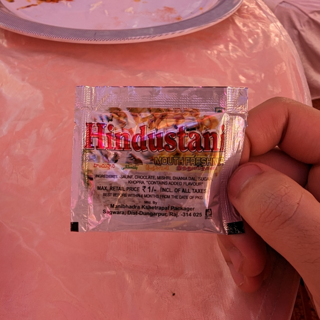 일단 준비된 밥을 간단히 먹었습니다. 난과.. 바삭한 난과.. 약과 같은 밥과 오이 등이 나오는데 인도 음식 이름을 들어도 자꾸 까먹어서 이름을 잘 모르겠습니다. 다 먹고 나서는 Mukhwas라는 인도인들이 주로 먹는 입가심용 향신료를 받았습니다. 인도인들에게는 굉장히 보편적인 제품 같았는데 제게는 맞지 않아 다른 사람들이 나눠줄 때마다 거절했습니다.