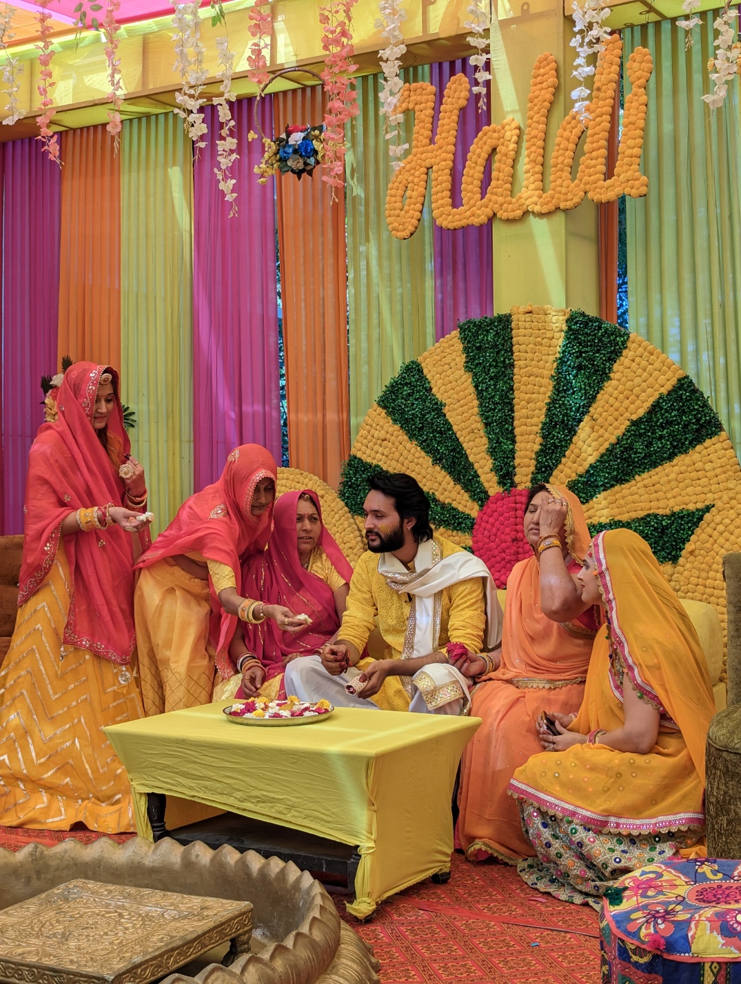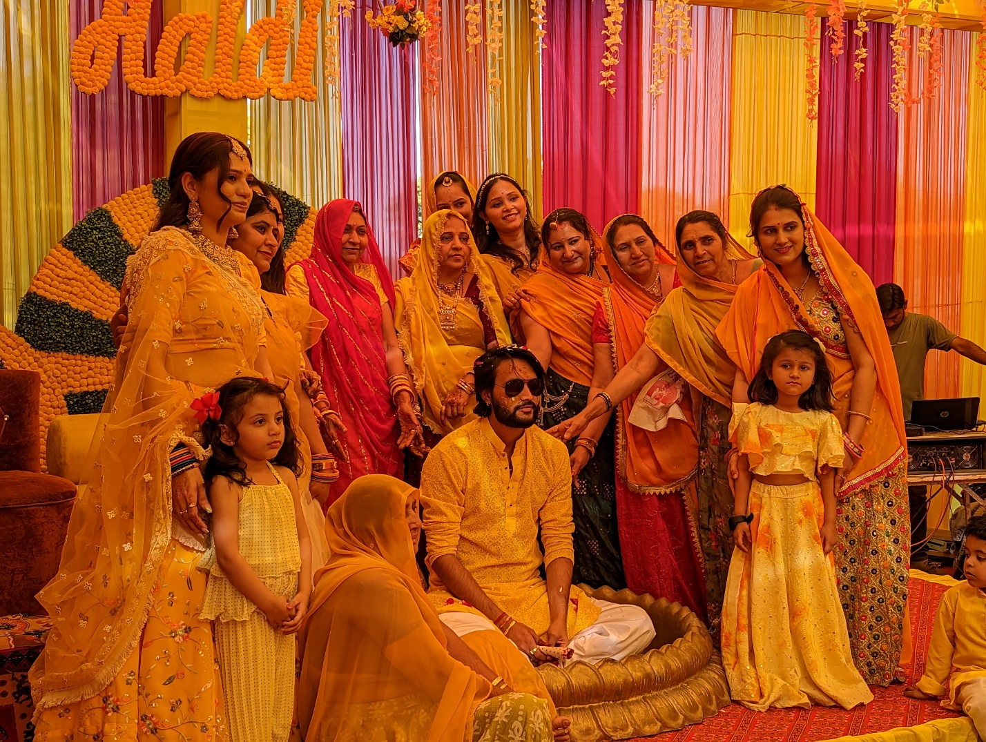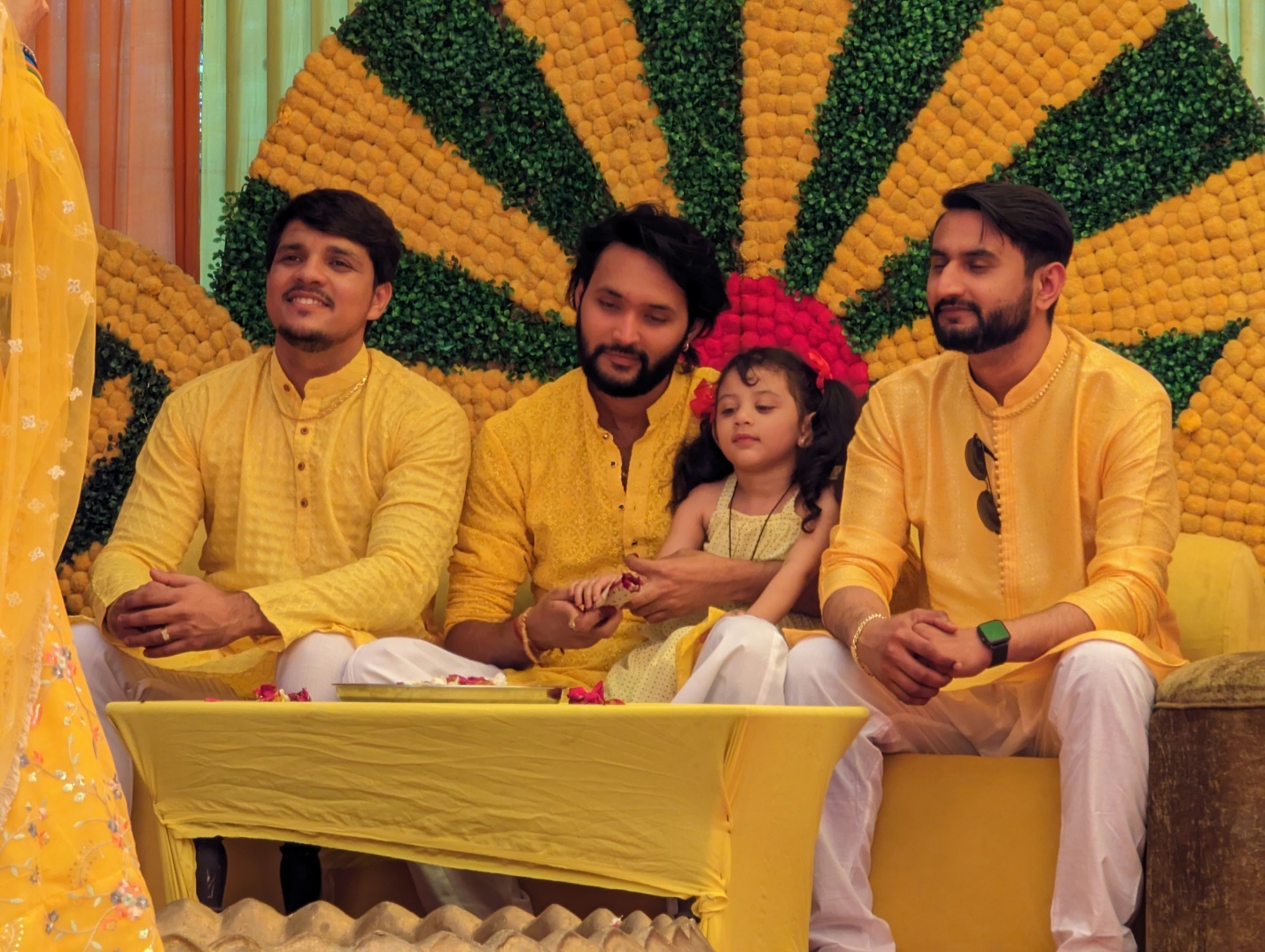 첫날은 할디(Haldi)라고 하는 행사를 하고 가까운 가족들이 같이 모여 얘기를 나누고 춤을 추며 놉니다. 할디 행사를 할 때 미리 약속한 색의 옷을 입고 와서 신랑을 축하해 주는데, 이 날은 노란색이었습니다.