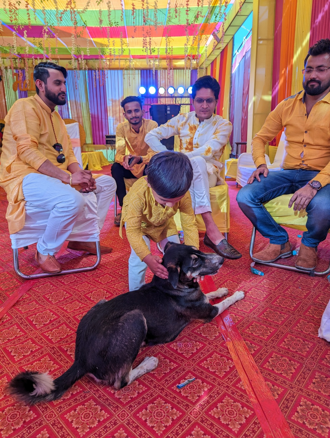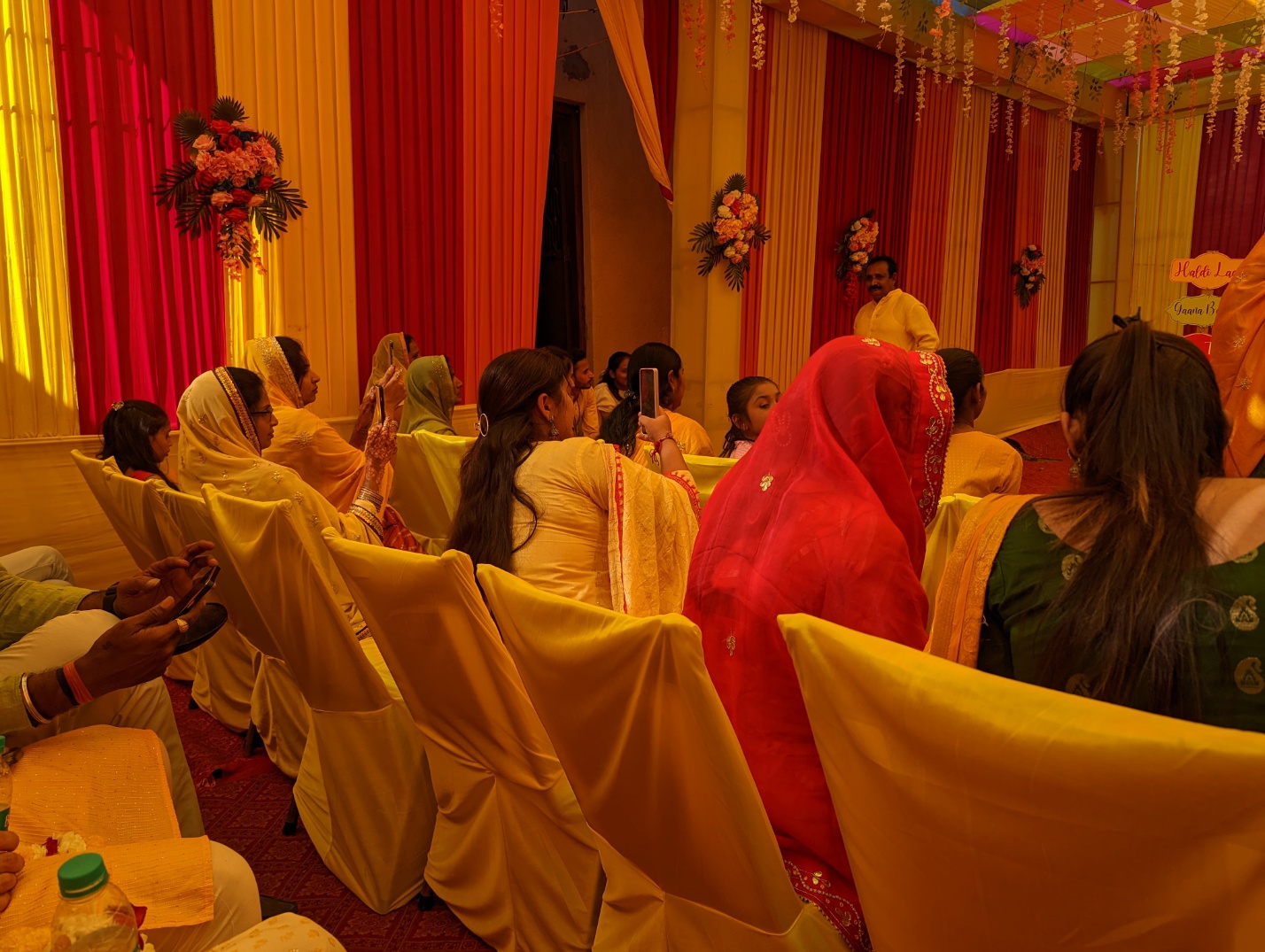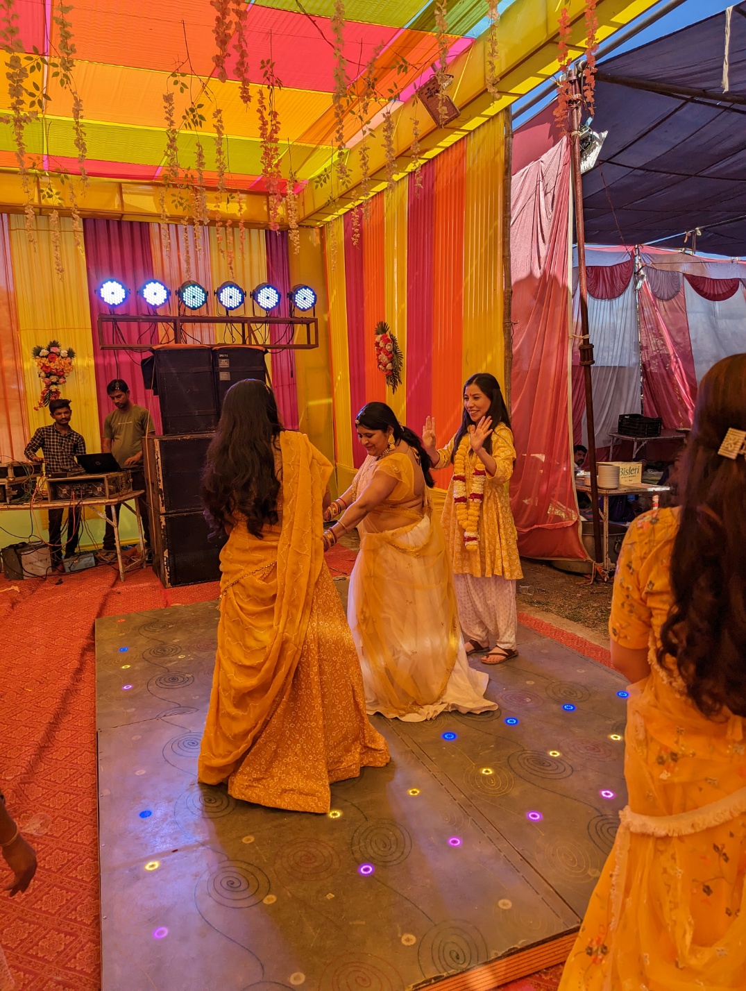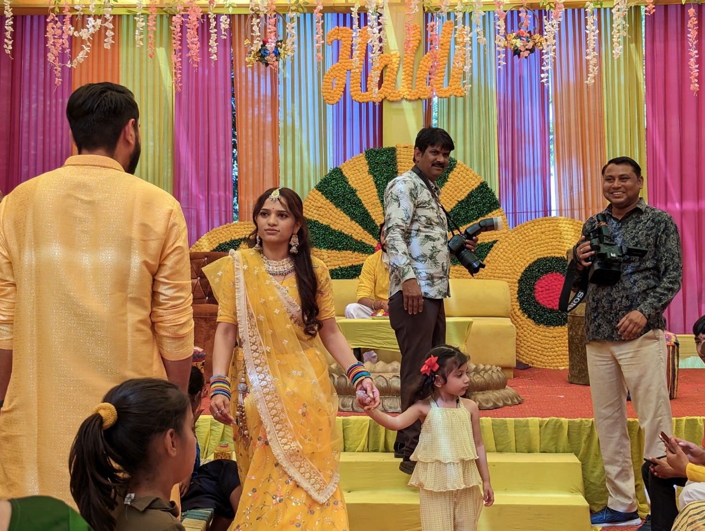 첫날은 할디(Haldi)라고 하는 행사를 하고 가까운 가족들이 같이 모여 얘기를 나누고 춤을 추며 놉니다. 할디 행사를 할 때 미리 약속한 색의 옷을 입고 와서 신랑을 축하해 주는데, 이 날은 노란색이었습니다.