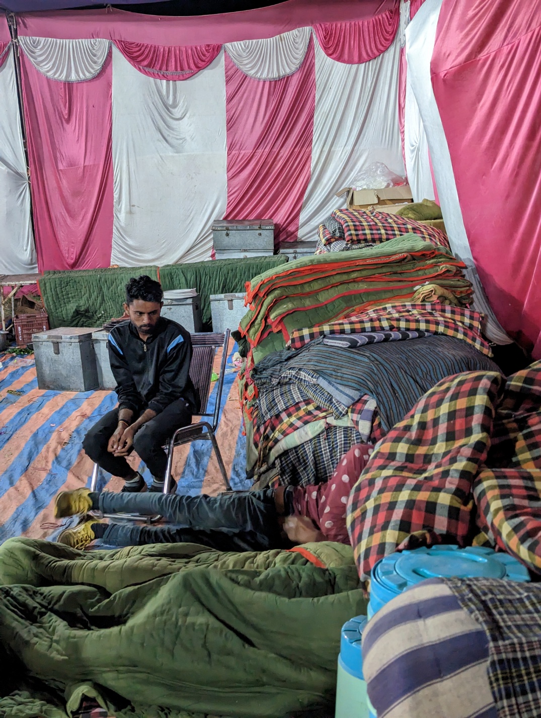 여름 날씨이기는 했지만, 요리하는 분들은 사진에 보이는 모포를 이용해서 현장에서 주무시는 것 같았습니다. 실제로 그들을 수용할 공간이 없기도 했습니다.
