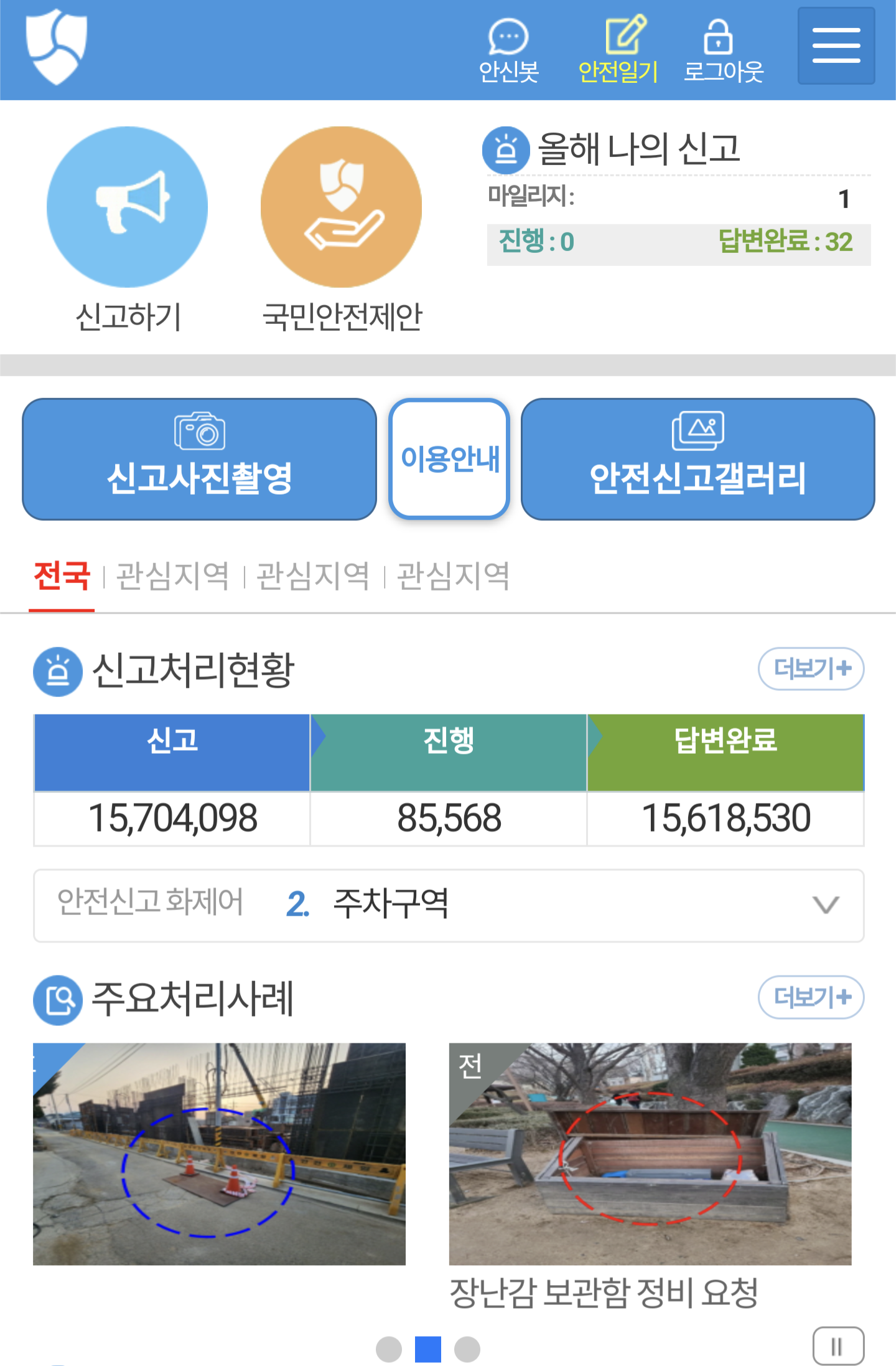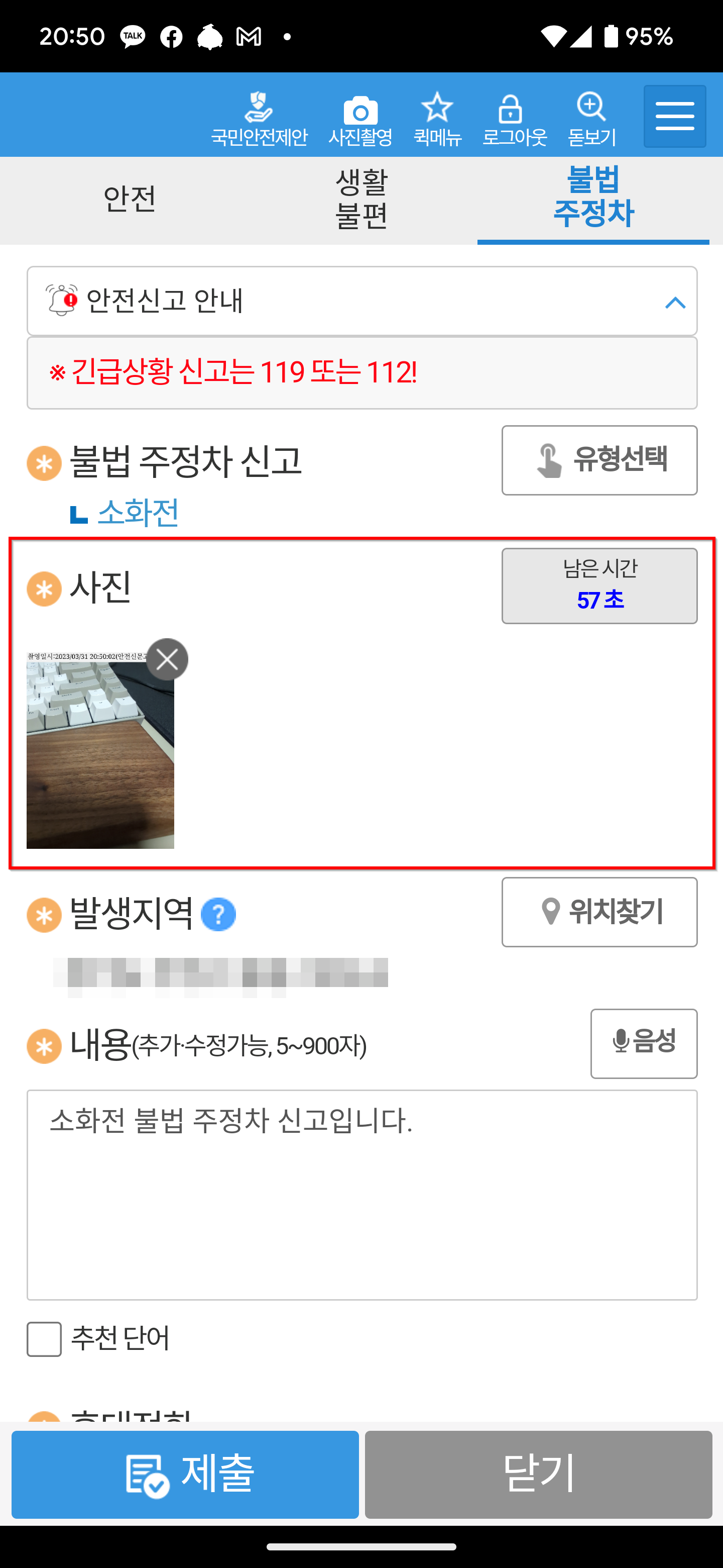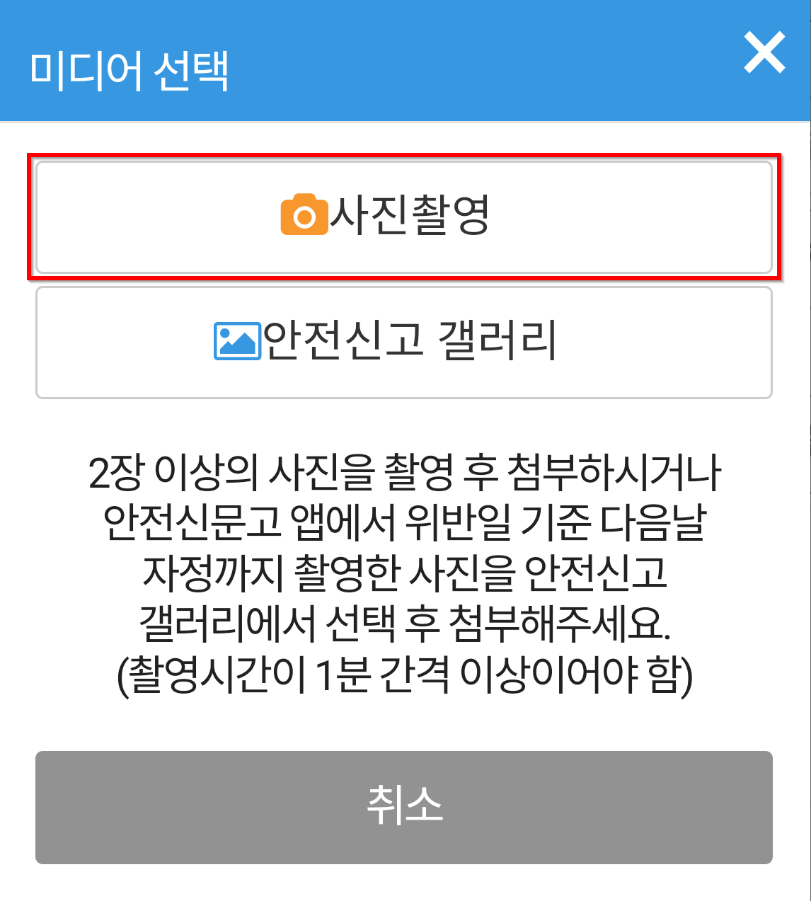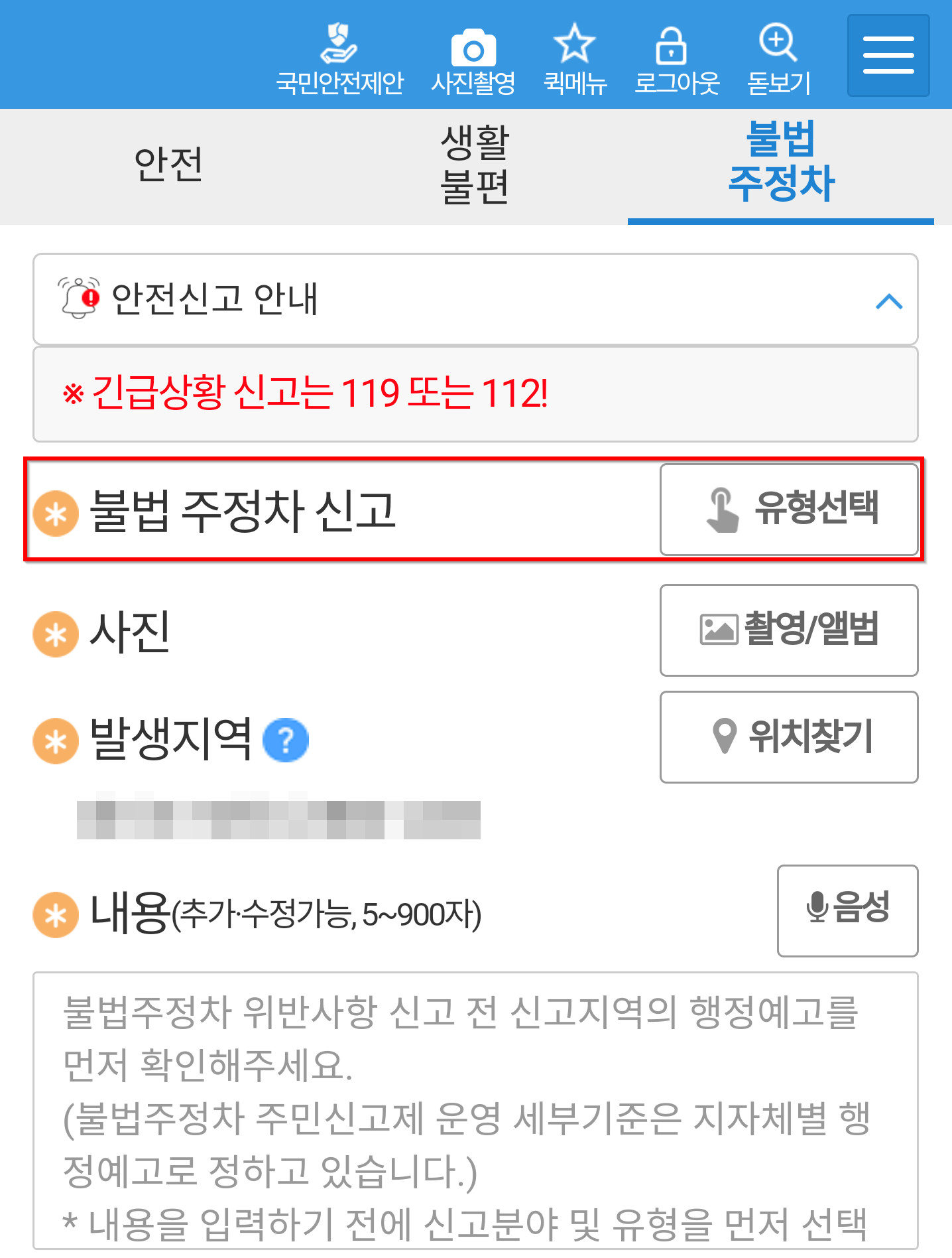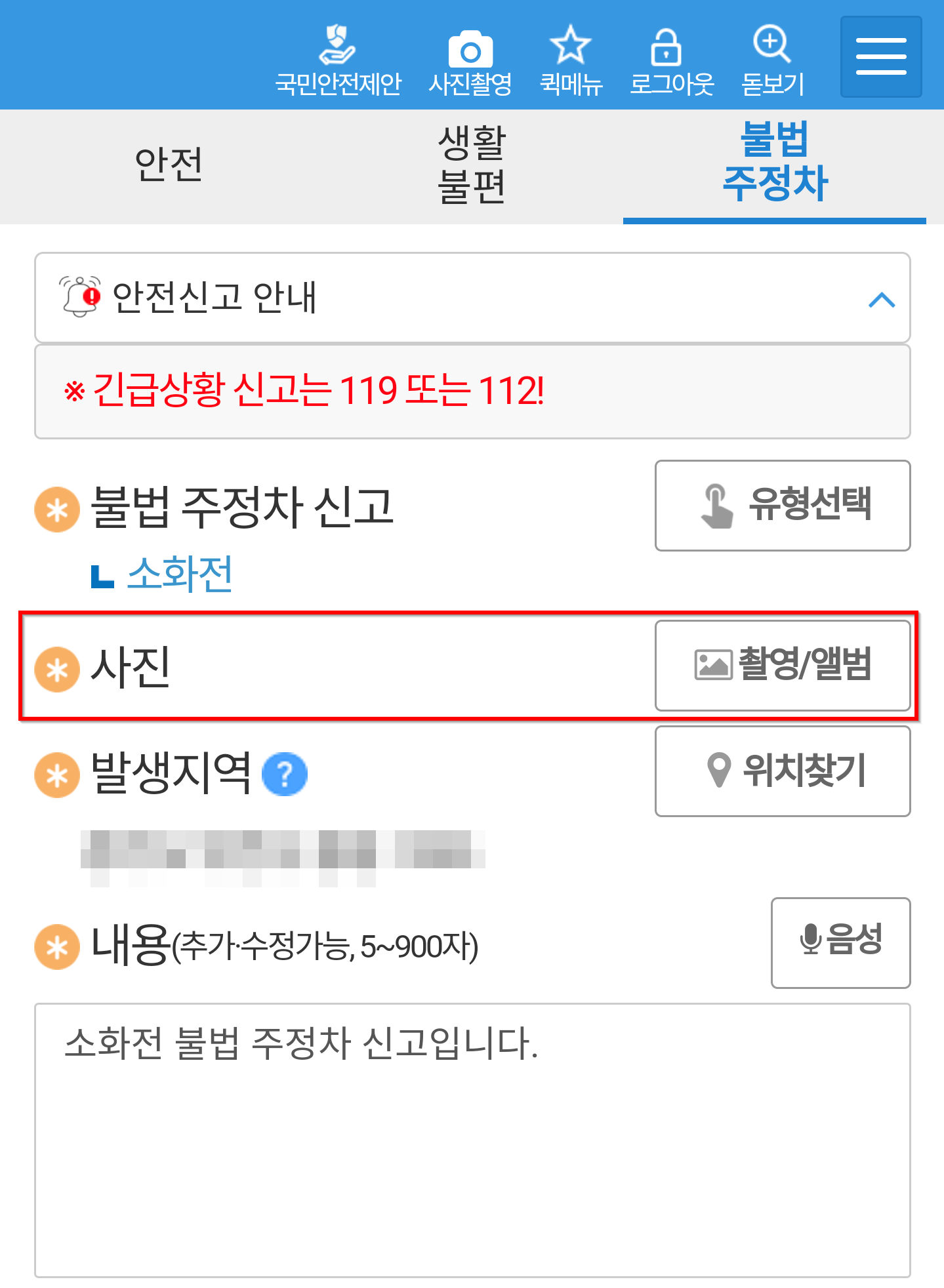 - 반드시 안전신문고 앱에 있는 카메라 기능으로 찍어야 합니다. 일반 카메라로 찍은 건 신고가 안됩니다.