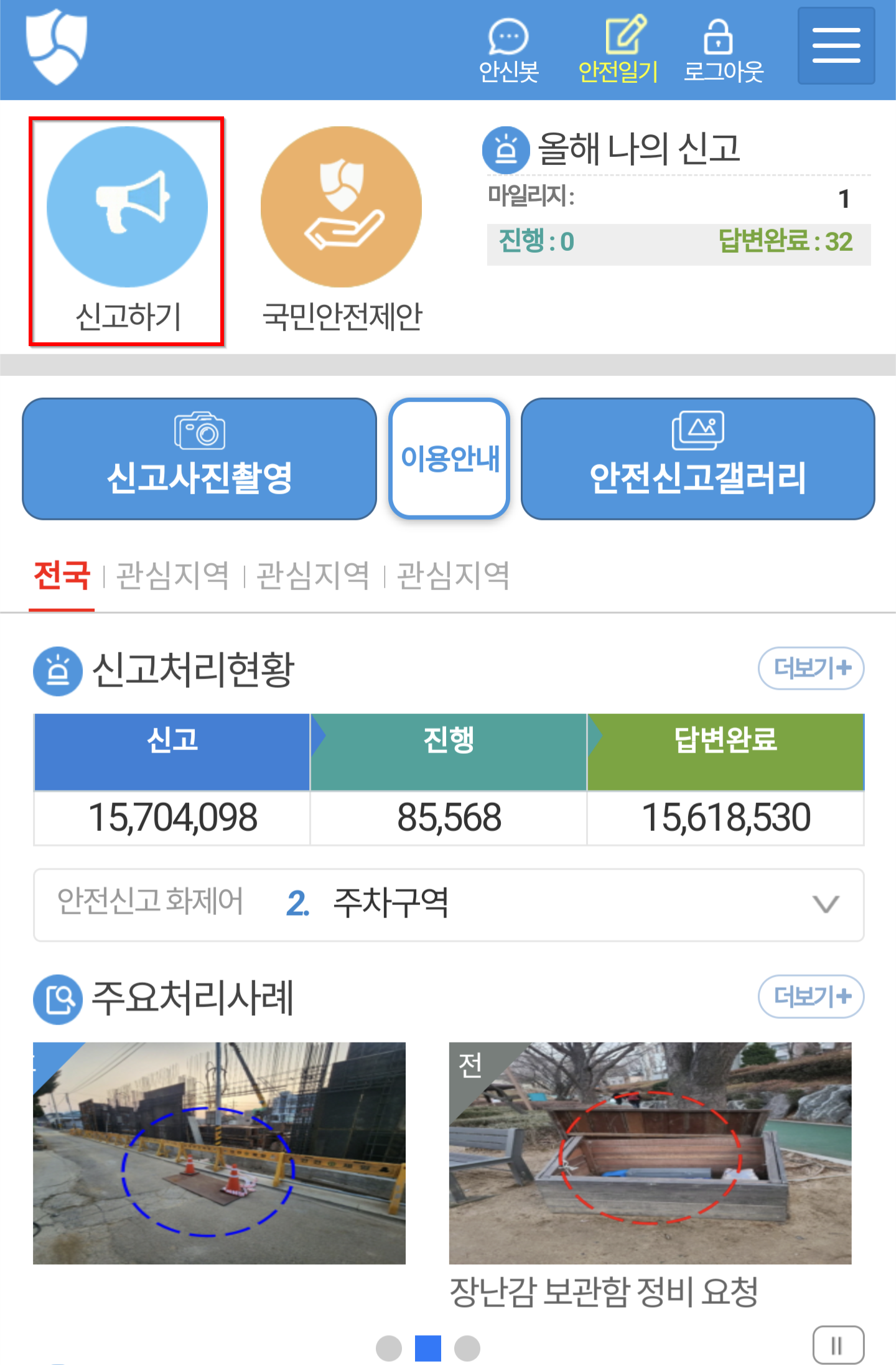 안전신문고 앱을 스마트폰에 다운 받아 실행한 뒤 로그인하면 위와 같은 화면을 볼 수 있습니다. (안전신문고 앱 다운로드, 회원가입, 로그인 과정은 생략하겠습니다.)