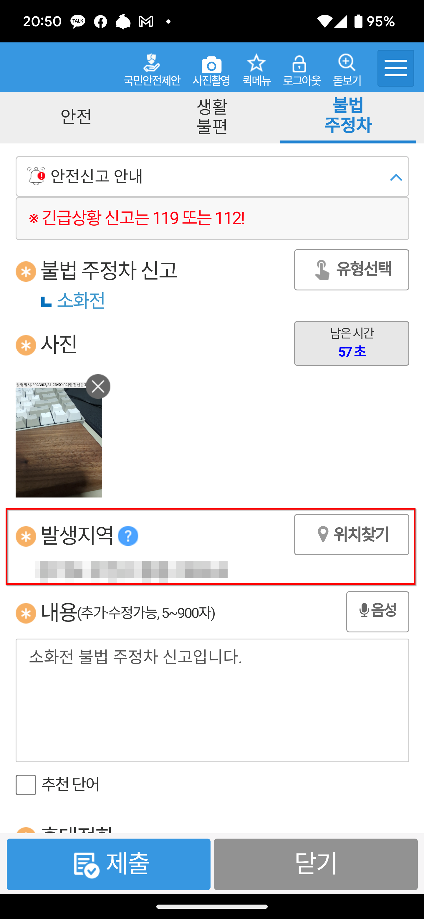 안전신문고 앱으로 찍은 사진만 신고가 가능하다 보니 사진에 위치정보가 남습니다. 그래서 보통은 발생지역이 사진 찍은 장소로 자동으로 설정됩니다만, 간혹 그러지 않은 경우가 있으니 주소와 '위치 찾기'를 눌러 지도로 위치를 다시 한번 확인해 줍니다.
