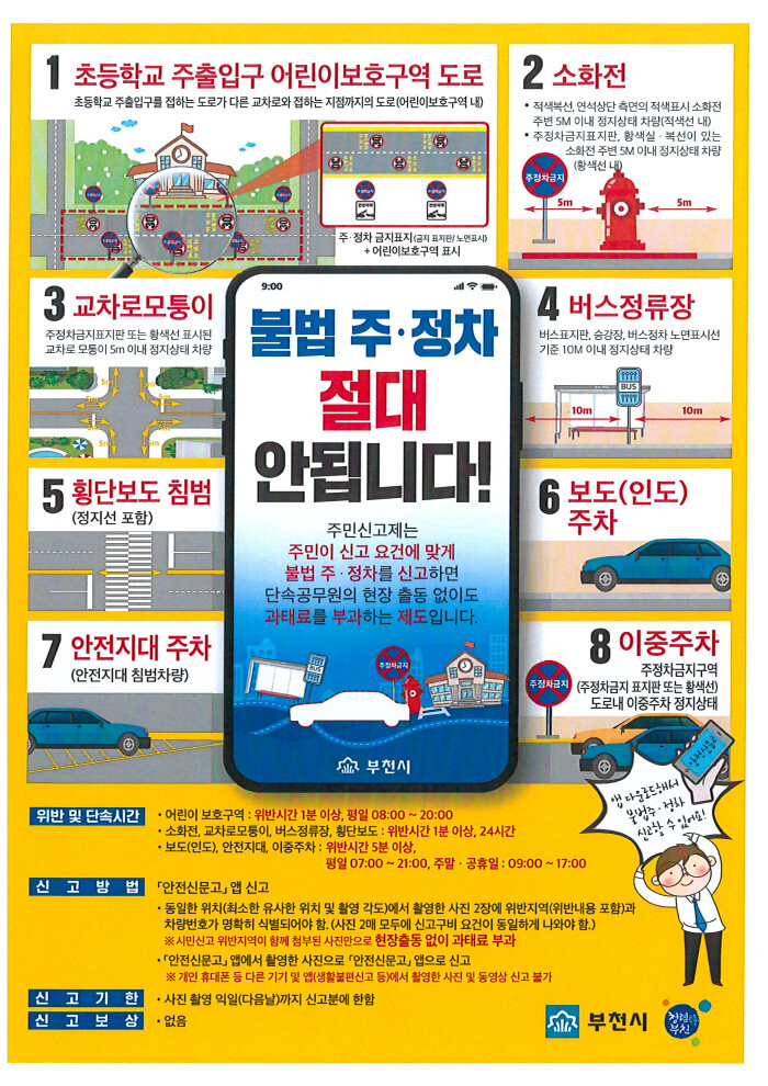 참고로 서울 25개 구는 8대 주차에 대해 24시간 신고가 가능하고, 1분 이상 주정차시 과태료 대상입니다. 그러나 경기도 일부 지역은 5대 주차에 한해서만 24시간 1분을 기준으로 하고, 인도주차, 이중주차 등은 5분까지 면제해 주며 그마저도 단속 시간을 정해둔 곳이 많습니다.