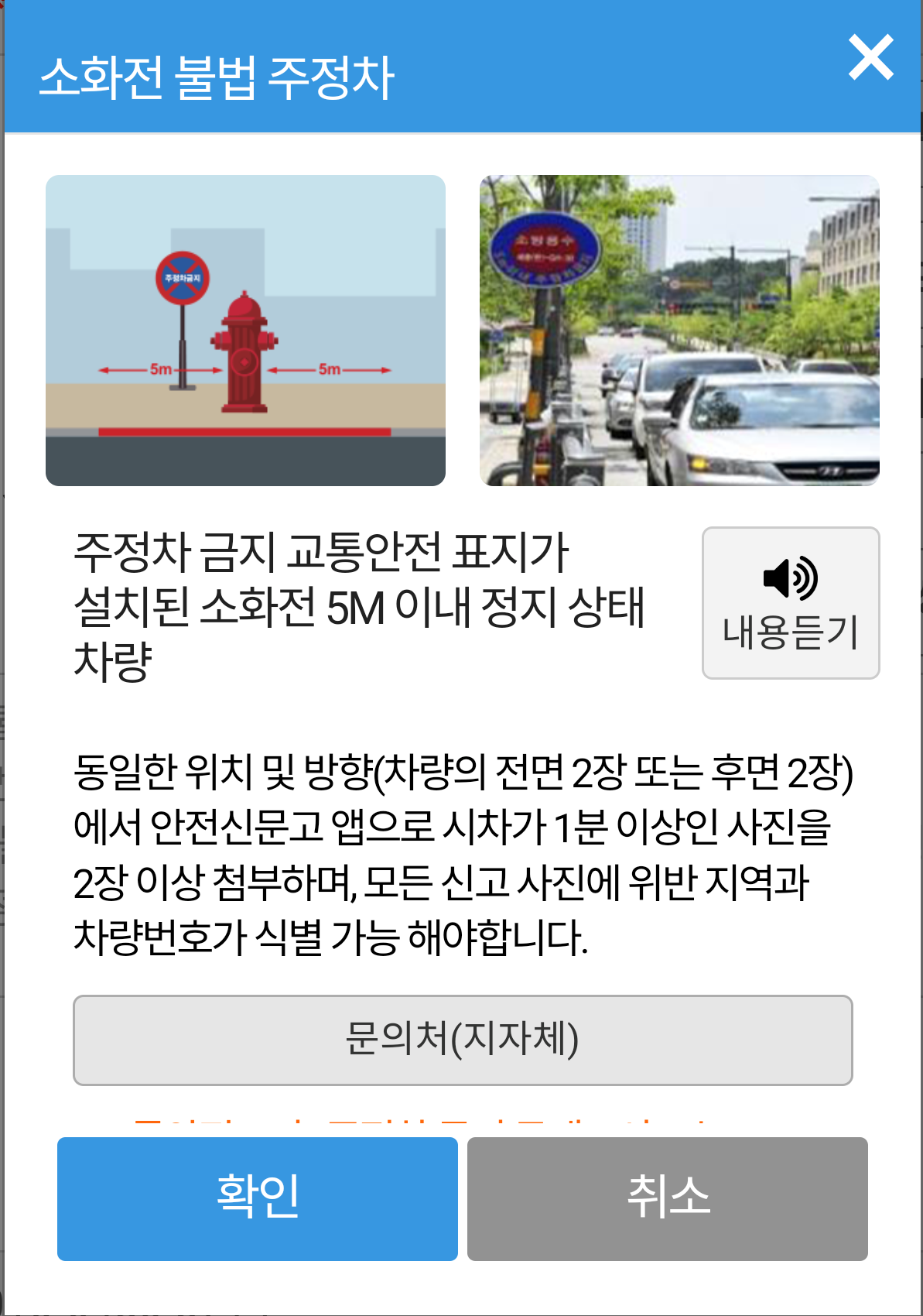 예시를 위해 소화전을 누른 화면입니다. 교통 위반 유형을 누르면 그 위반 유형에 대한 신고 기준이 나오니 한번 읽어보시길 추천드립니다.