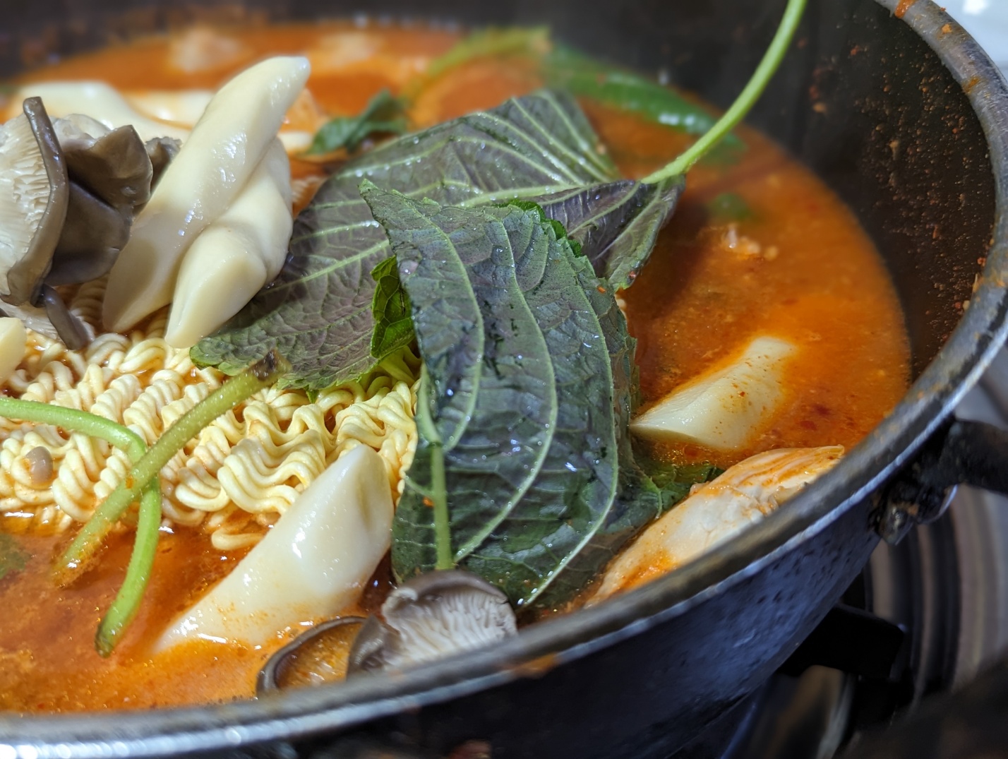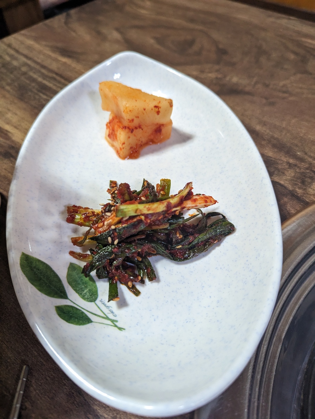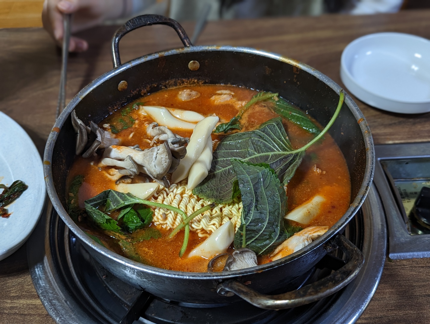 라면사리를 나중에 따로 주문한 옆 테이블을 보니 라면만 주는 게 아니라 깻잎도 같이 줍니다. 그리고 라면 먹을 때 저 깻잎과 파김치를 곁들여 먹으면 정말 맛있습니다. 파김치가 달달한 맛이 나는 게 맛있어서 여러 번 리필해서 먹었습니다.