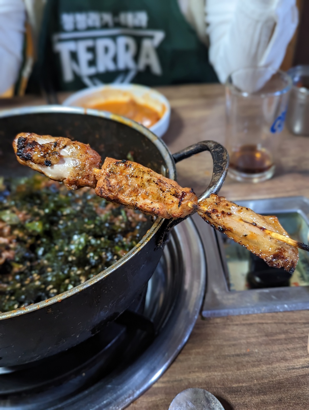 일단 닭도리탕을 다 먹을 때쯤 나옵니다. 이걸 먼저 먹고 닭도리탕을 먹으면 좀 좋을 것 같은데, 아무래도 사진처럼 연탄에 직접 구워주다 보니 어쩔 수 없습니다.