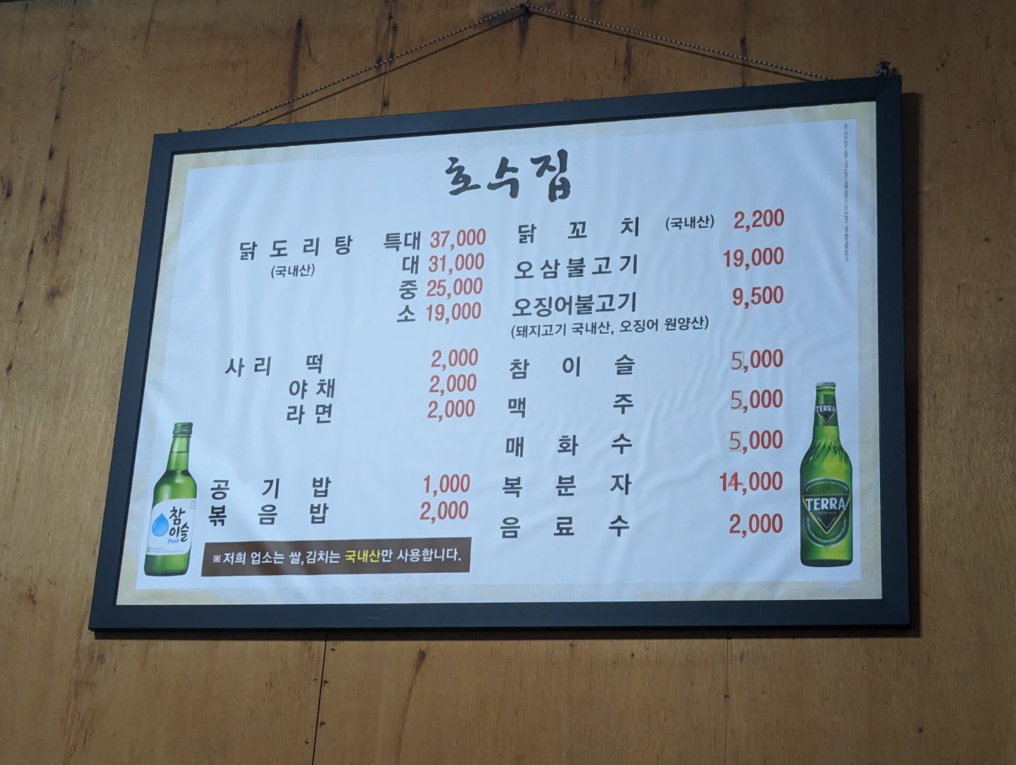 메뉴 구성은 간단합니다. 닭도리탕, 닭꼬치, 그리고 불고기류가 있습니다만... 적어도 맛집이라고 찾아온 분들 중에서 불고기 드신 분은 못 봤습니다. 대다수 손님들이 닭도리탕을 먹습니다.
