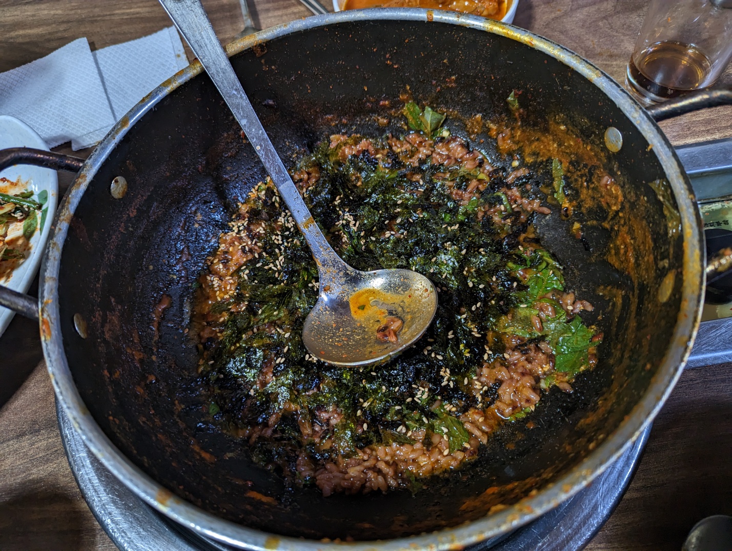 볶음밥을 주문하면 냄비에 있는 건더기를 덜어내고 냄비를 가져가 직접 볶아 가져다주십니다. 불을 켜서 좀 더 데워 먹는 것을 추천합니다. 맛은 참기름 향이 좀 센 편이라 기름지게 느껴질 수 있습니다.