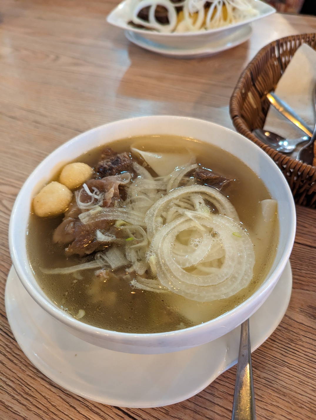Шорпа из баранины - 양고기 소르파입니다. 생김새부터 한국의 갈비탕스러웠는데, 그 맛도 그냥 갈비탕 맛이었습니다. 사용하는 고기 부위도 같았습니다. 다 먹고 나서 양인줄 알았습니다. 소고기인 줄 알았습니다...