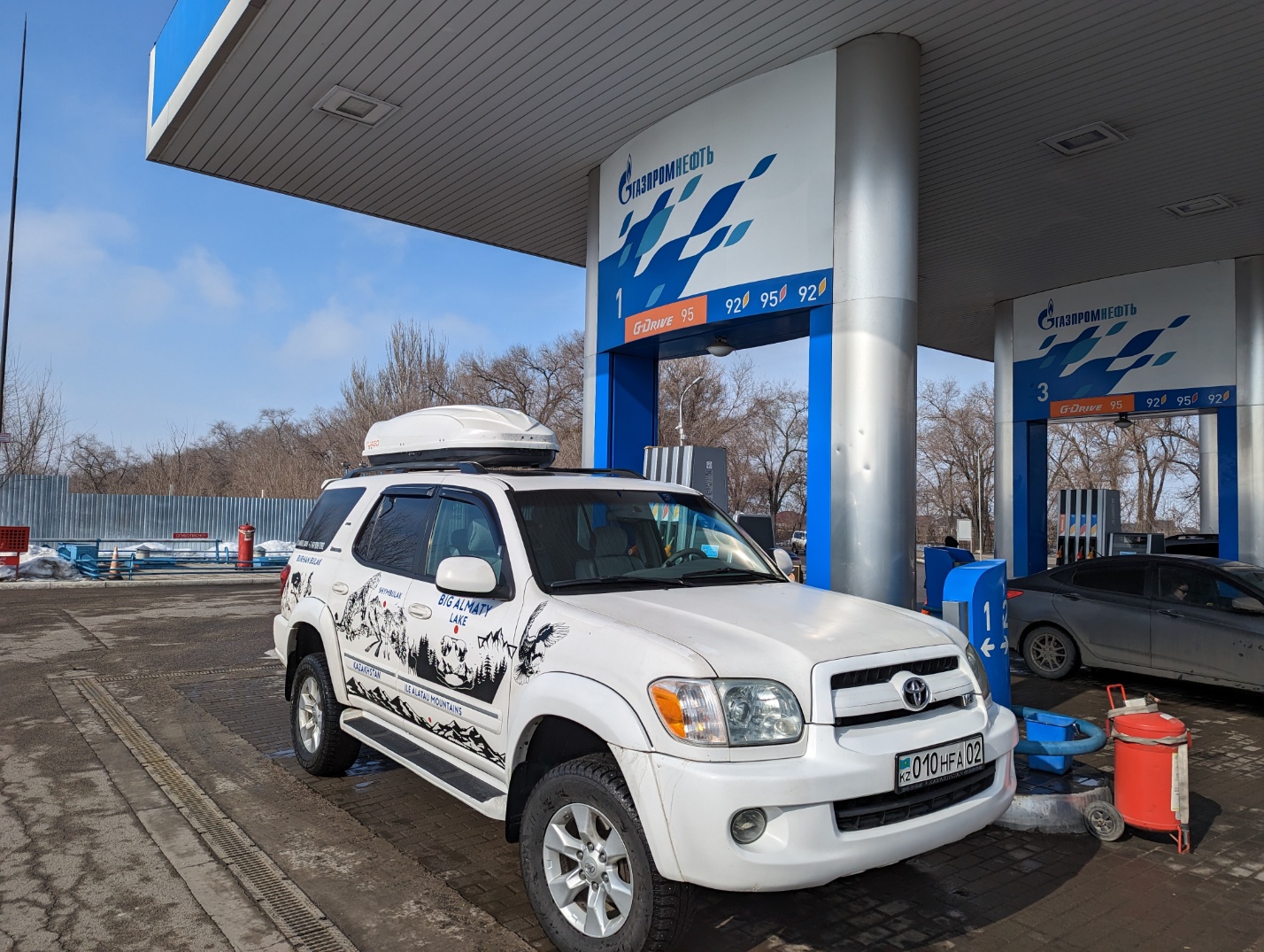 한 시간 뒤에 영어가 가능한 가이드를 호텔로 보내준다고 해서 기다렸더니 아주 훌륭한 차를 끌고 왔습니다. 캐년에 가는데 4x4 랜드크루져... 아주 어울립니다. 인도에서 우버로 90년대 차 같은 것만 타다가 이 차를 타니 거의 롤스로이스였습니다. 뉴스 사회, 경제면에서 많이 보이던 가즈프롬 주유소도 처음으로 구경했습니다.