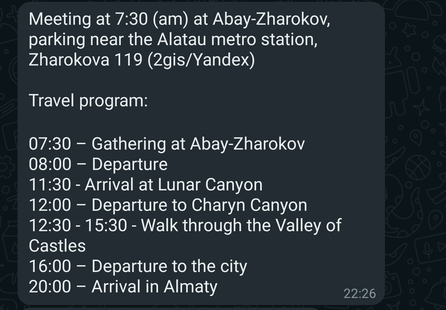 차른캐년 투어는 하루 전 구글링을 하다 찾은 Vlad라는 사람과 연락이 닿아 투어를 예약했습니다. 연락을 해보니 이 친구는 가이드는 아니고 여러 투어를 알선해 주는 사람인 듯했습니다. 약간 가격이 싯가인 것 같기는 한데, 결과적으로 여행은 만족스러웠으니 링크를 남겨드리겠습니다. 참고로 카자흐스탄은 왓츠앱을 이용하니 미리 프로필 설정을 하고 가는 것을 추천드립니다.