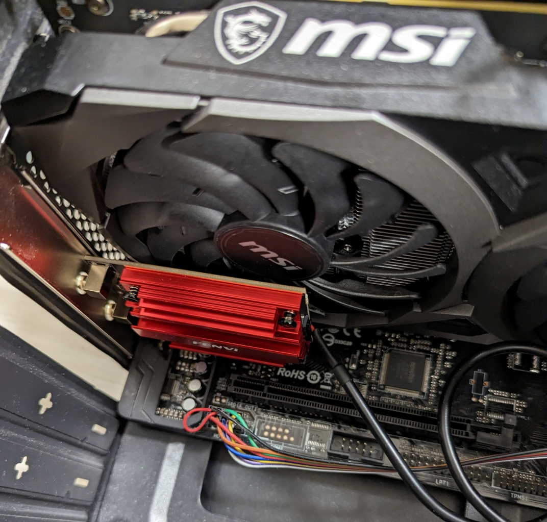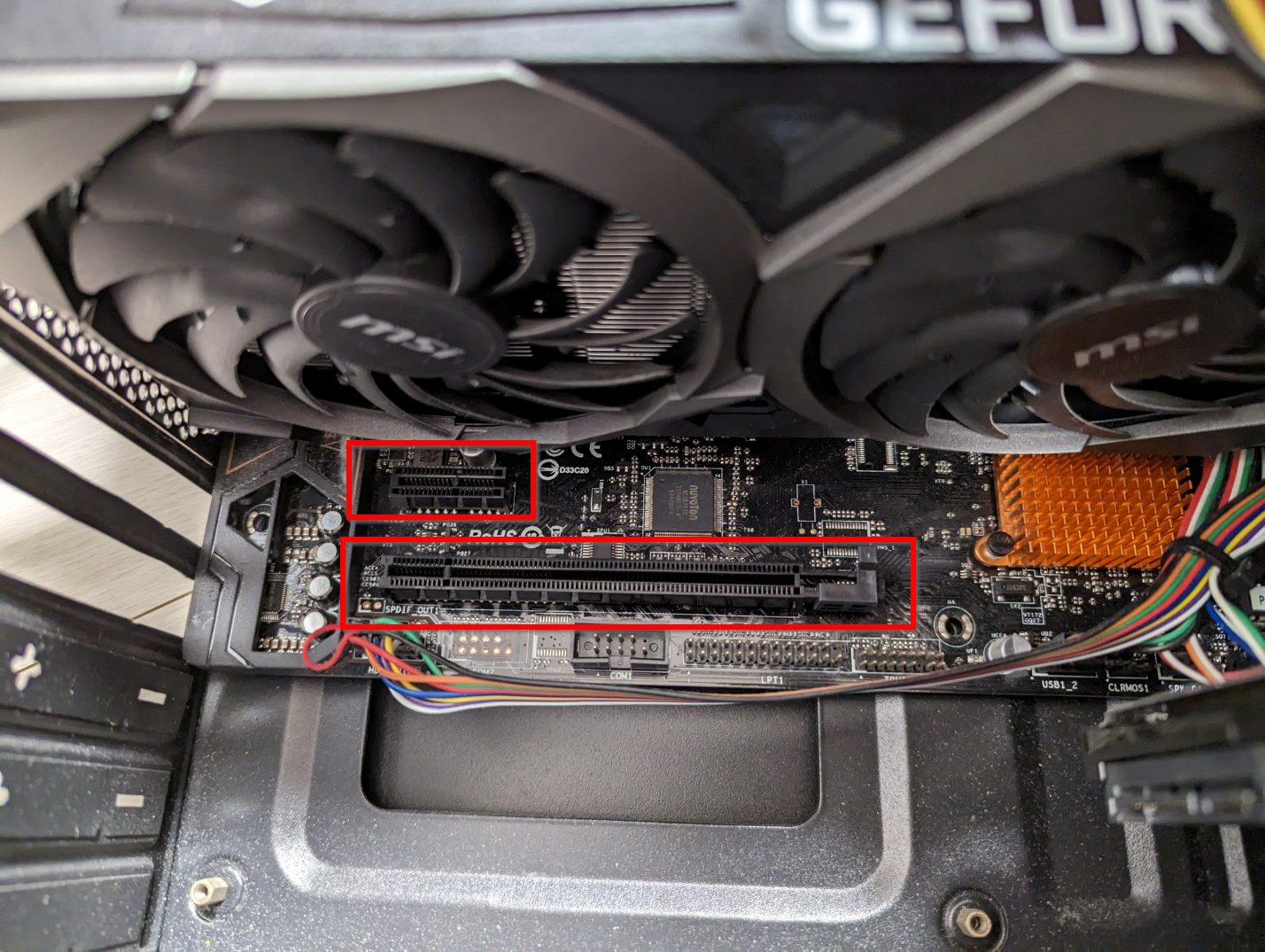 메인보드에 PCI-E 슬롯이 있는 부분입니다. 이미 거대한 그래픽카드가 한 칸을 차지하고 있고, 저한테 남은 건 빨갛게 박스 쳐 둔 두 부분입니다. 저 둘 중 아무 곳에나 끼워도 됩니다. 다만 긴 쪽에 꽂을 때는 왼쪽에 붙여서 꽂으시면 됩니다.