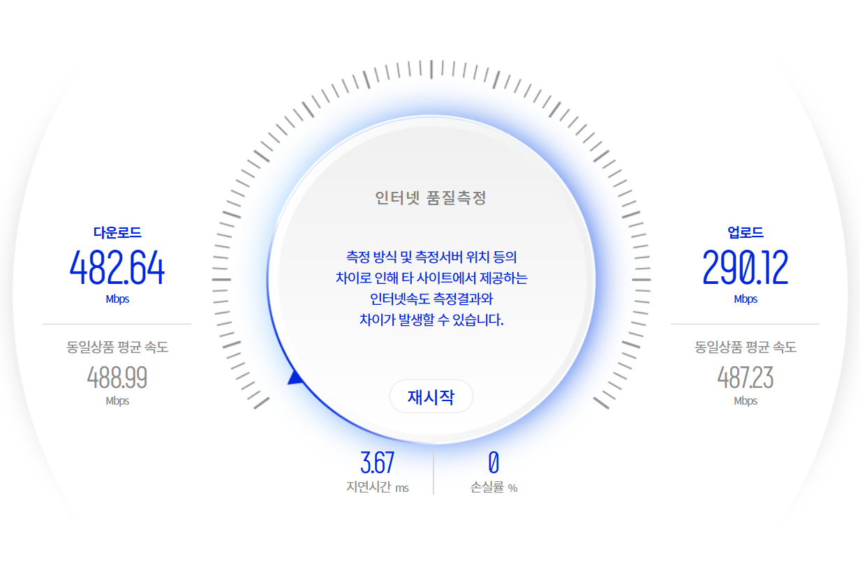동일한 환경에서 무선랜카드를 이용해 5GHz 와이파이에 연결하고 테스트한 결과입니다. 다운로드는 482.64Mbps, 업로드는 290.12Mbps로 업로드에서 조금 차이가 납니다.