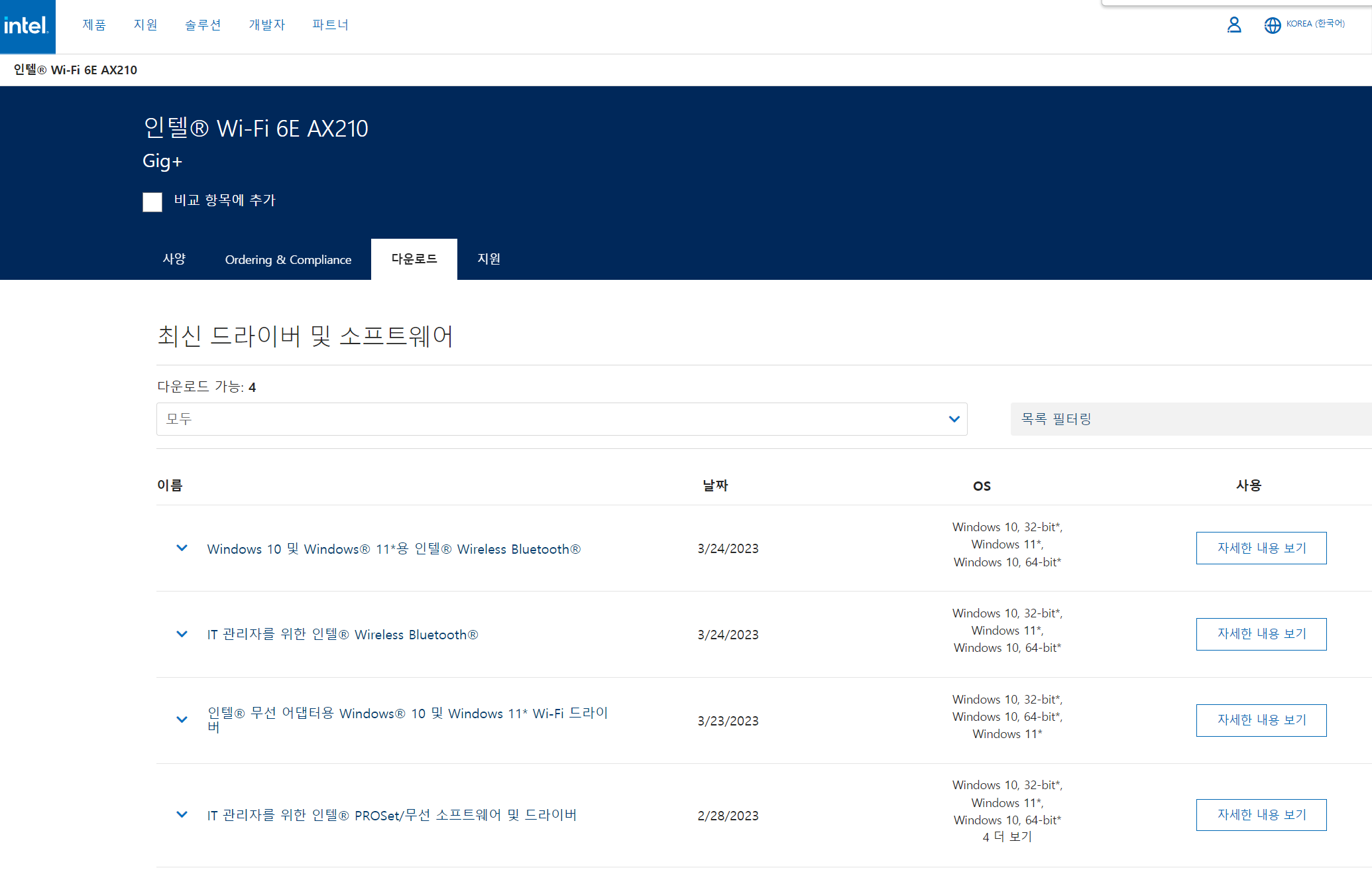 제가 구매한 제품의 메인 칩셋은 인텔의 AX210입니다. 인텔 홈페이지에서 제품을 검색하면 드라이버 다운로드가 가능합니다.