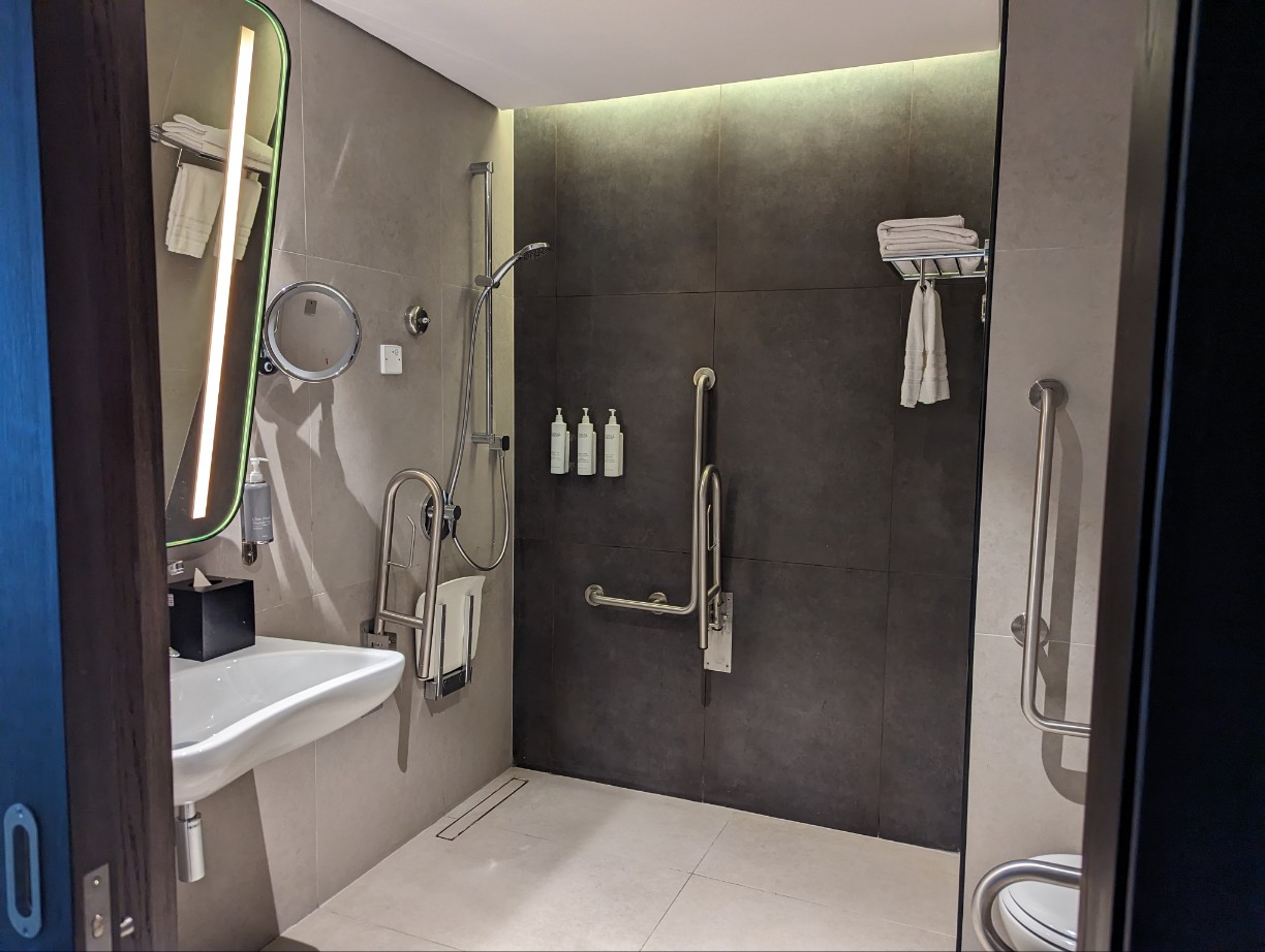 금연 객실이 장애인용 객실만 남아 장애인용 객실은 처음 사용해 봤습니다. 방과 화장실 사이즈는 다 같은데 사진처럼 장애인이 편히 사용할 수 있게 화장실에 기둥이 설치되어 있습니다. 그런데 화장실이 워낙 커서 불편함은 전혀 없었습니다. 다른 방은 이렇지 않습니다.