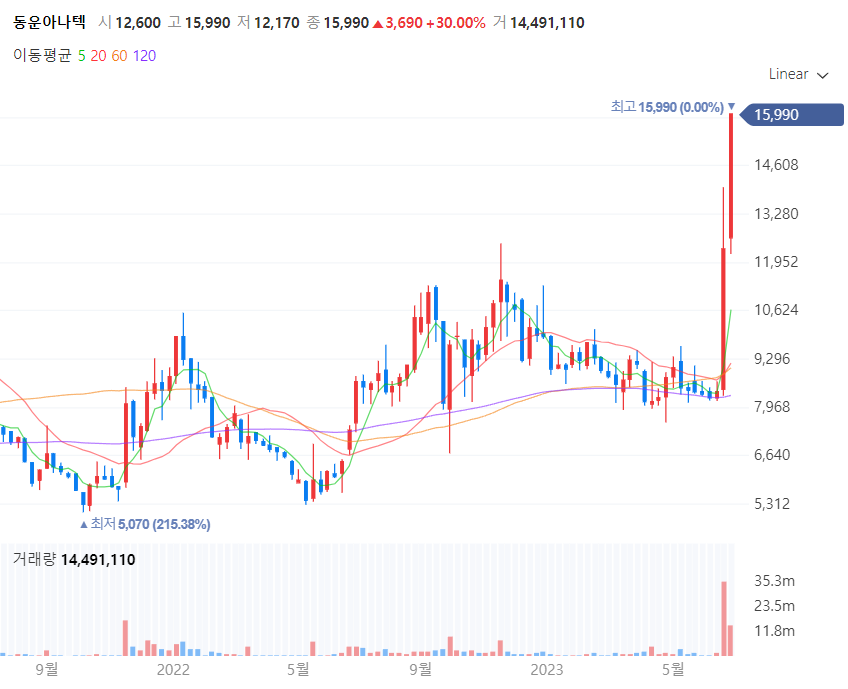 2020년부터 샀다 팔았다 했던 동운아나텍이라는 불과 일주일 전만 해도 아는 사람 없던, 거래량이 50억 도 안되던 작은 회사가 갑자기 일주일 사이에 상한가를 두 번 치며 날뛰고 있습니다.