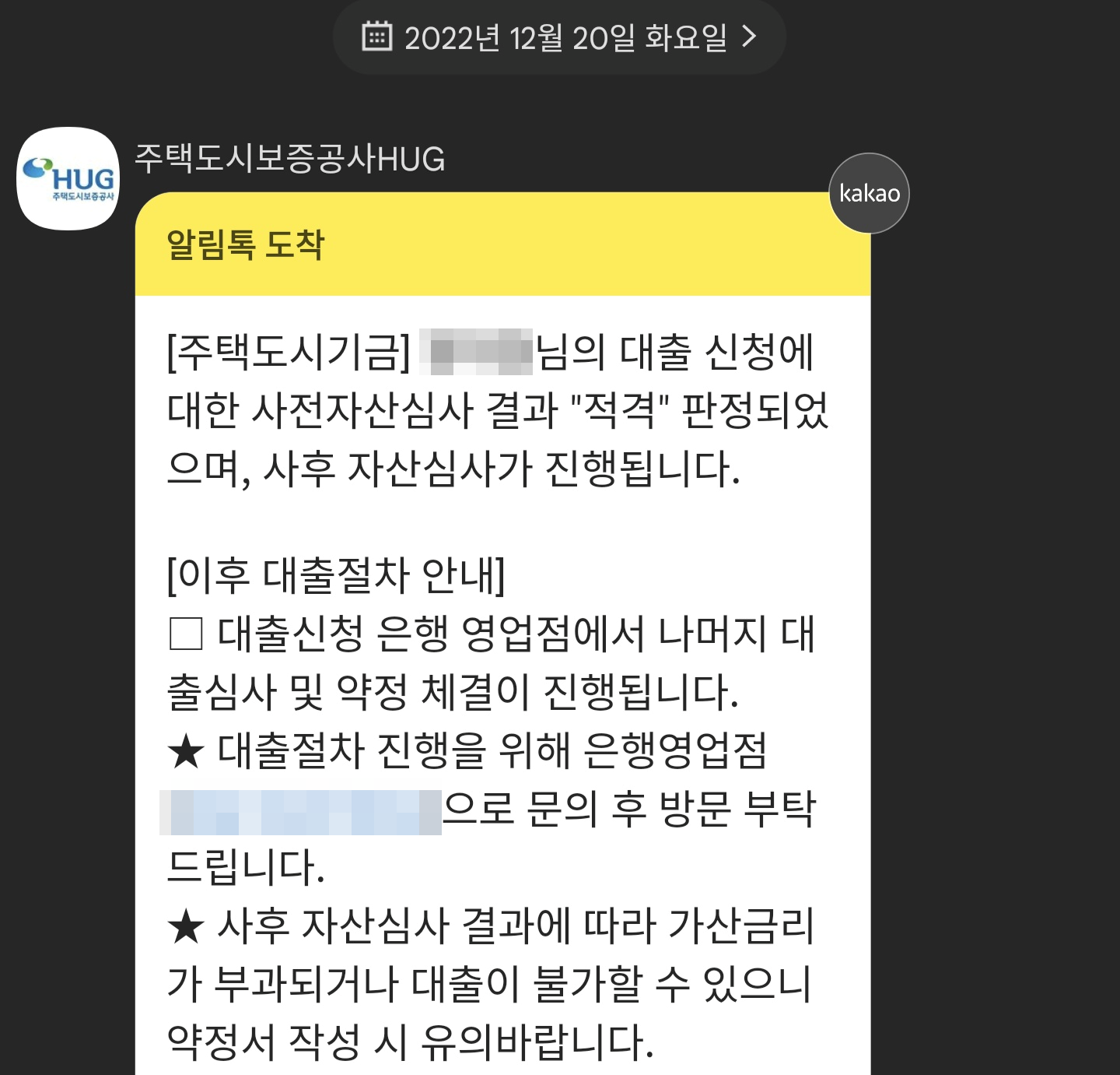 저는 계약서 확정일자가 등록된 일요일에 신청했는데 바로 이틀 뒤인 화요일에 결과가 나왔습니다. 여기까지 왔으면 이제 대출에 큰 걸림돌은 없다는 얘기입니다. 그리고 HF로 신청해도 카톡은 HUG에서 옵니다.