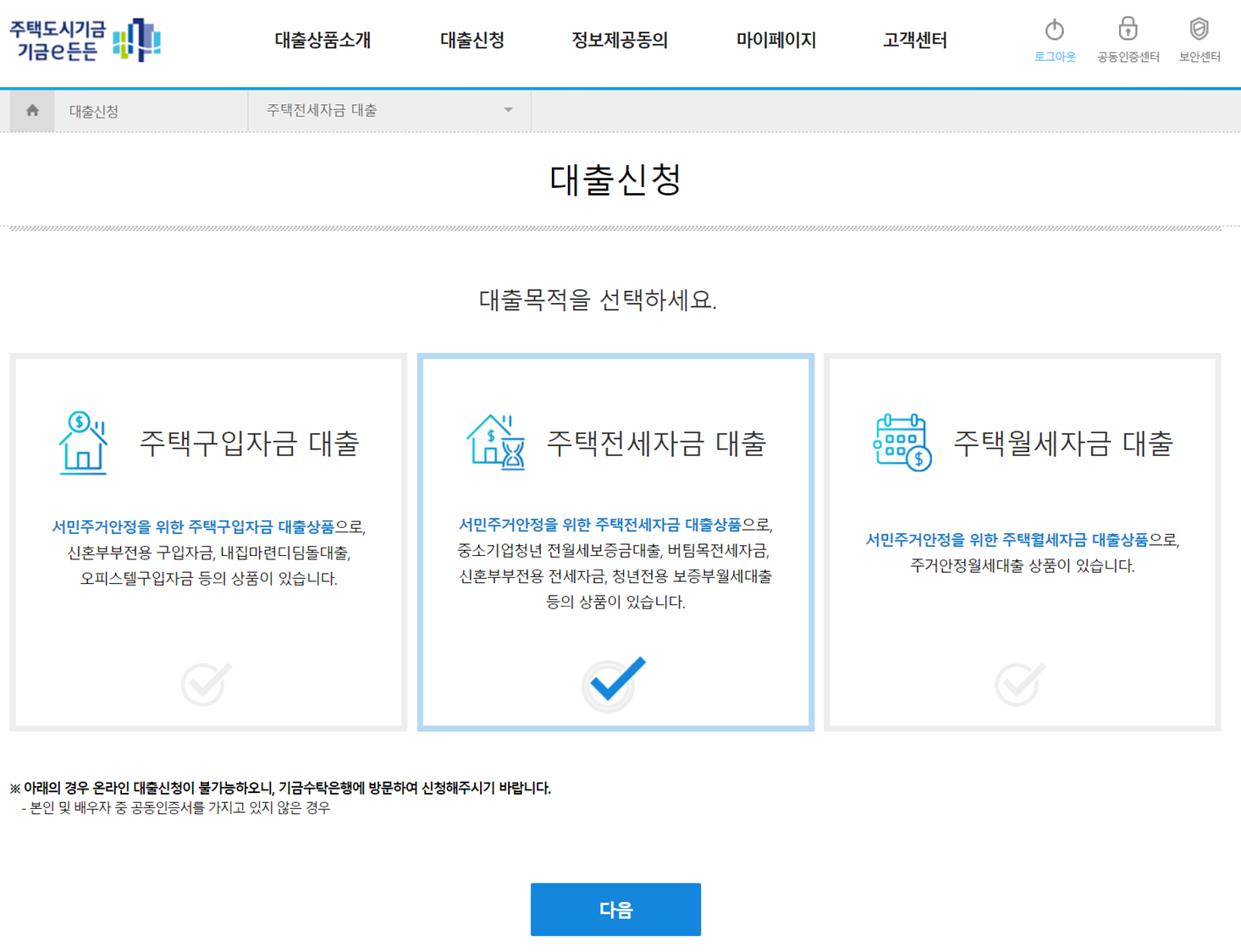 로그인을 하고 대출신청→ 주택전세자금 대출을 눌러줍니다. 그다음 화면에서 입력하라는 내용 모두 입력하면 됩니다.