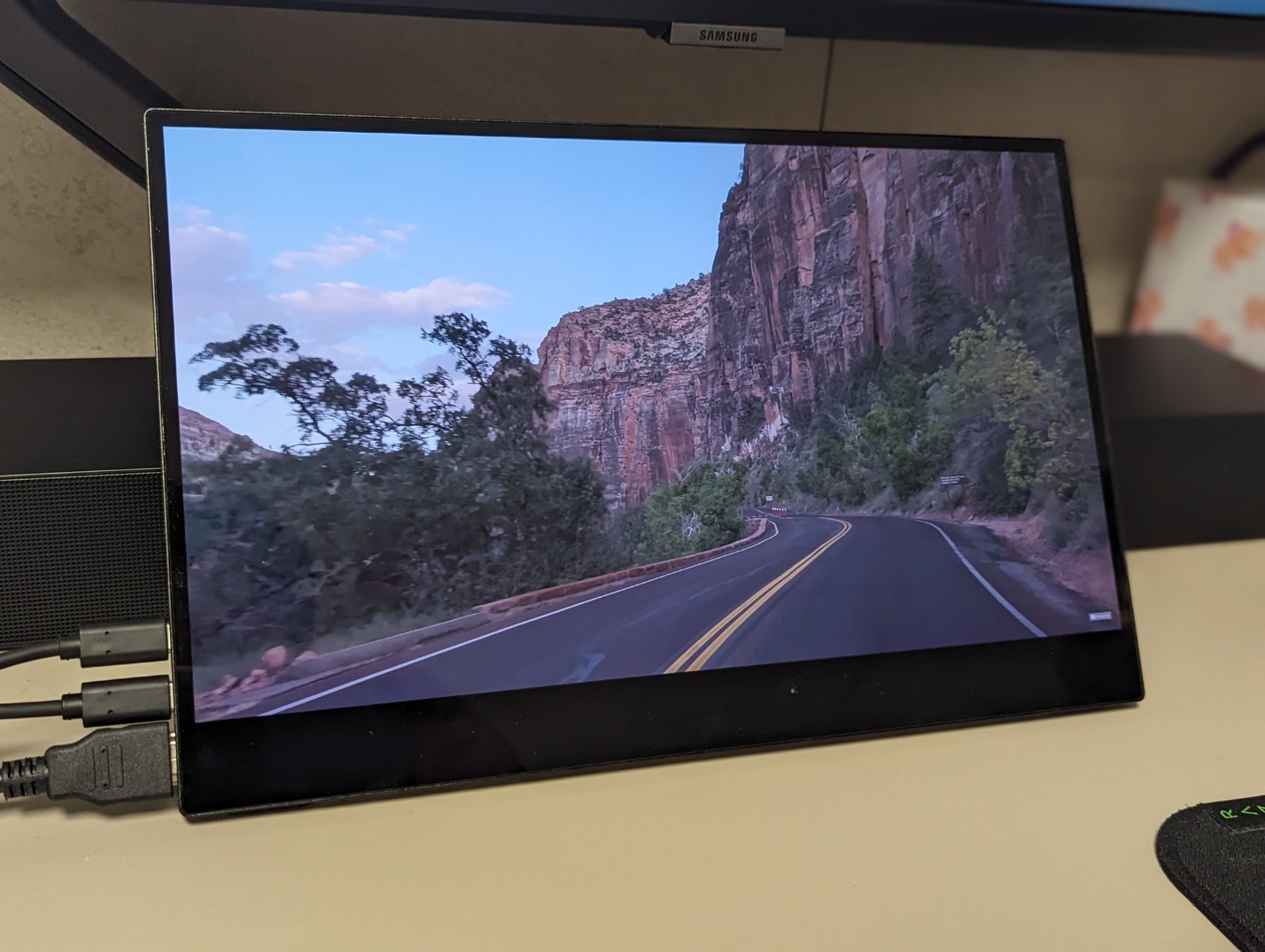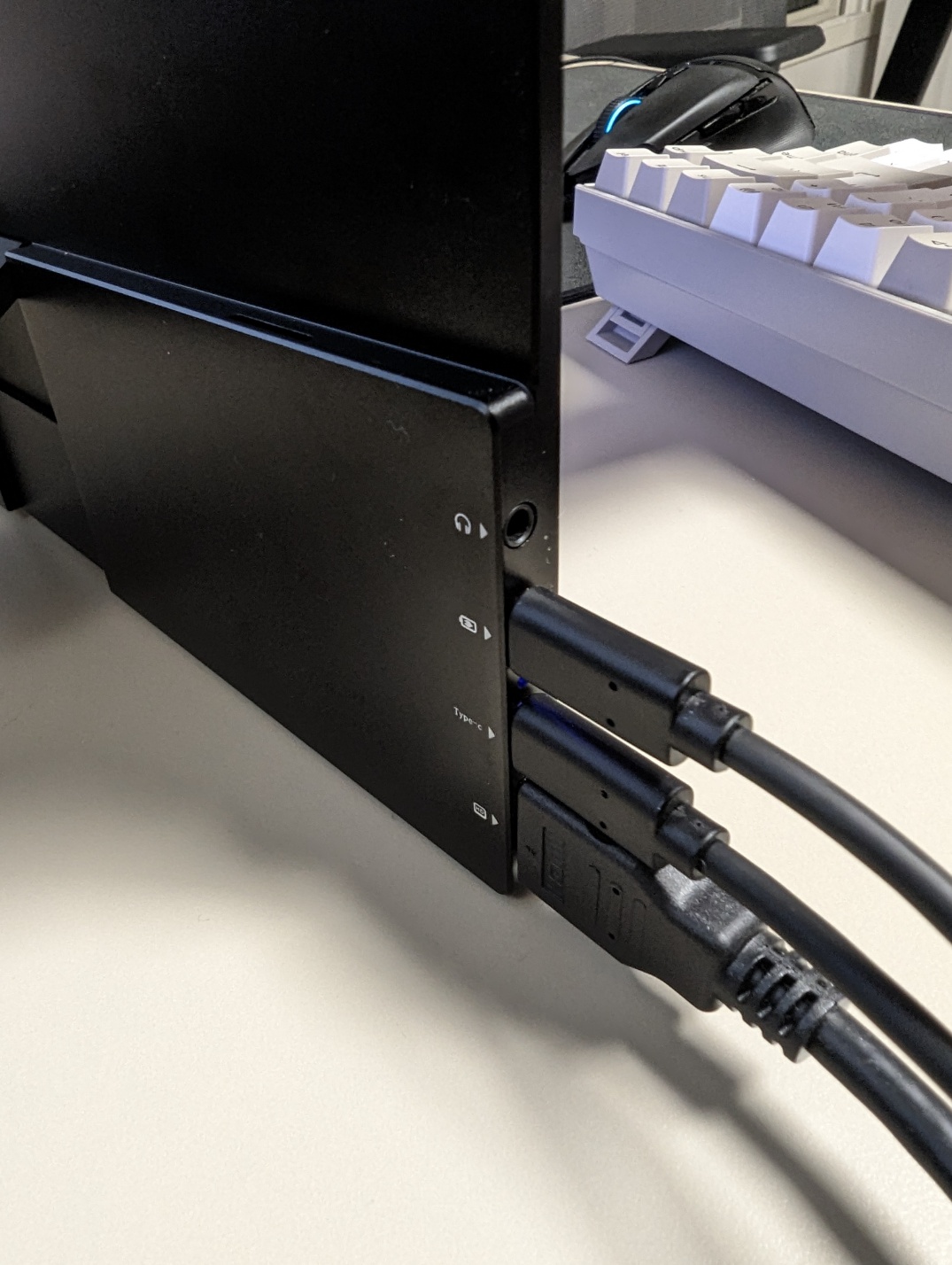 화면 왼쪽에는 3.5mm 포트, 전원 공급을 위한 C타입 포트, 터치를 위한 C타입 포트, HDMI 포트가 순서대로 있습니다. 터치 관심 없으면 그냥 C타입 연결해서 폰 충전용으로 써도 좋습니다.