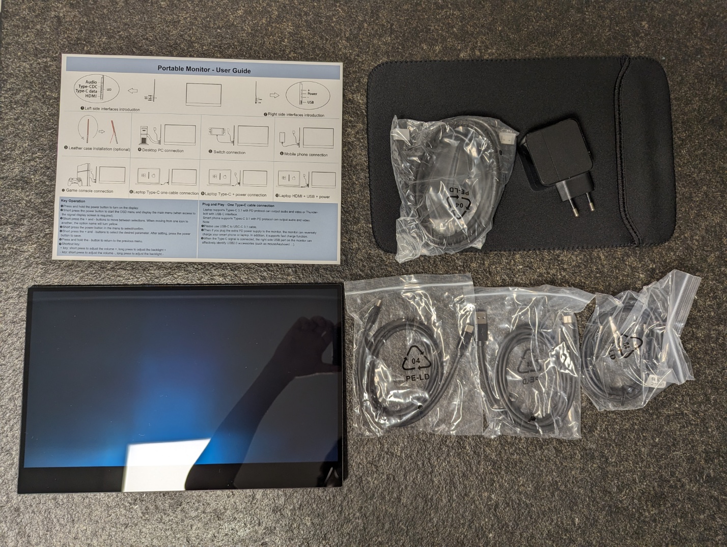 구성품은 설명서, 모니터, 콘센트, c to c 케이블2개, HDMI 케이블 1개, 케이스가 왔습니다. 충전기는 동봉된 것을 이용하지