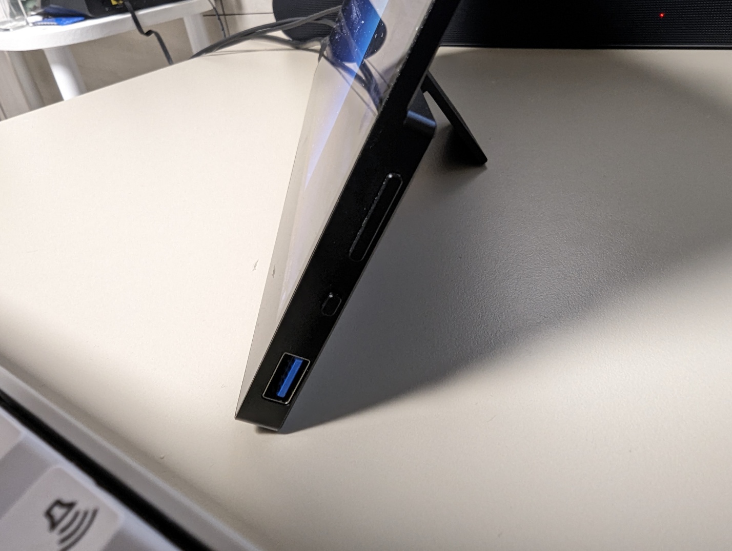 화면 오른쪽에 USB 2.0 포트와 왜 3.0인척 파란색 칠해놨지? 전원 버튼, 음량/밝기 조절 버튼이 있습니다.