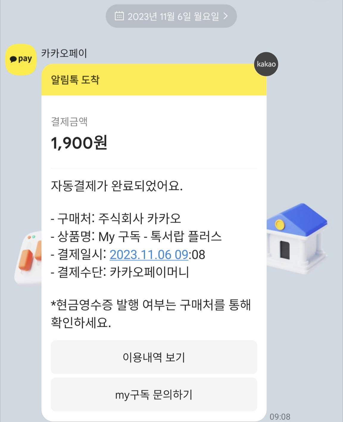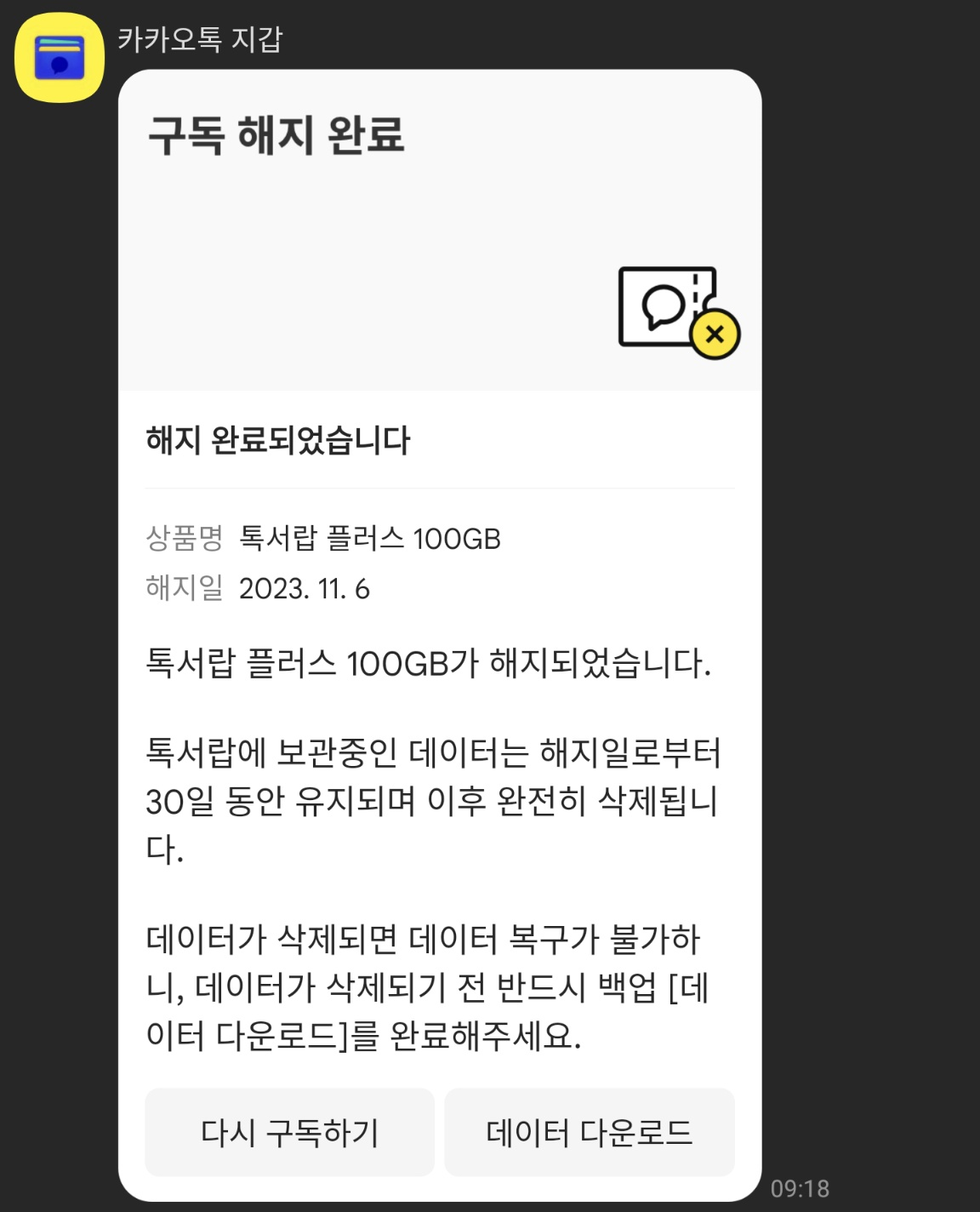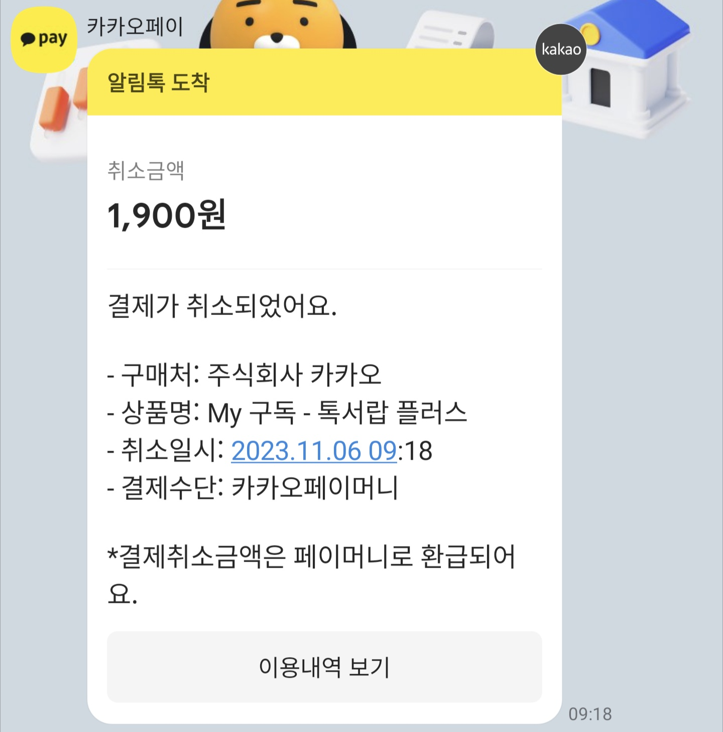 해지하면 금액이 취소된 내역이 카카오톡 메시지로 옵니다.