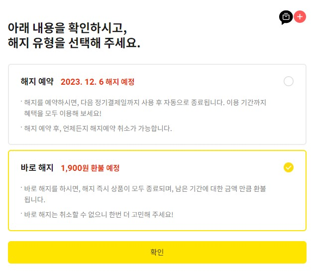 해지를 어떻게 할지 골라줍니다. 바로 해지할지 이번달 까지는 쓸지 선택하면 됩니다.