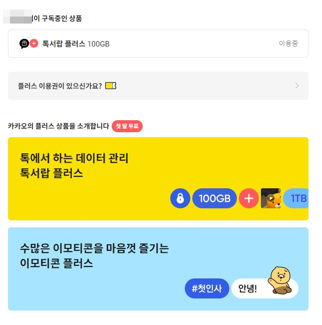 My구독에 접속하면 톡서랍 플러스 100GB 이용중이라고 나오는데 그것을 터치해 줍니다.