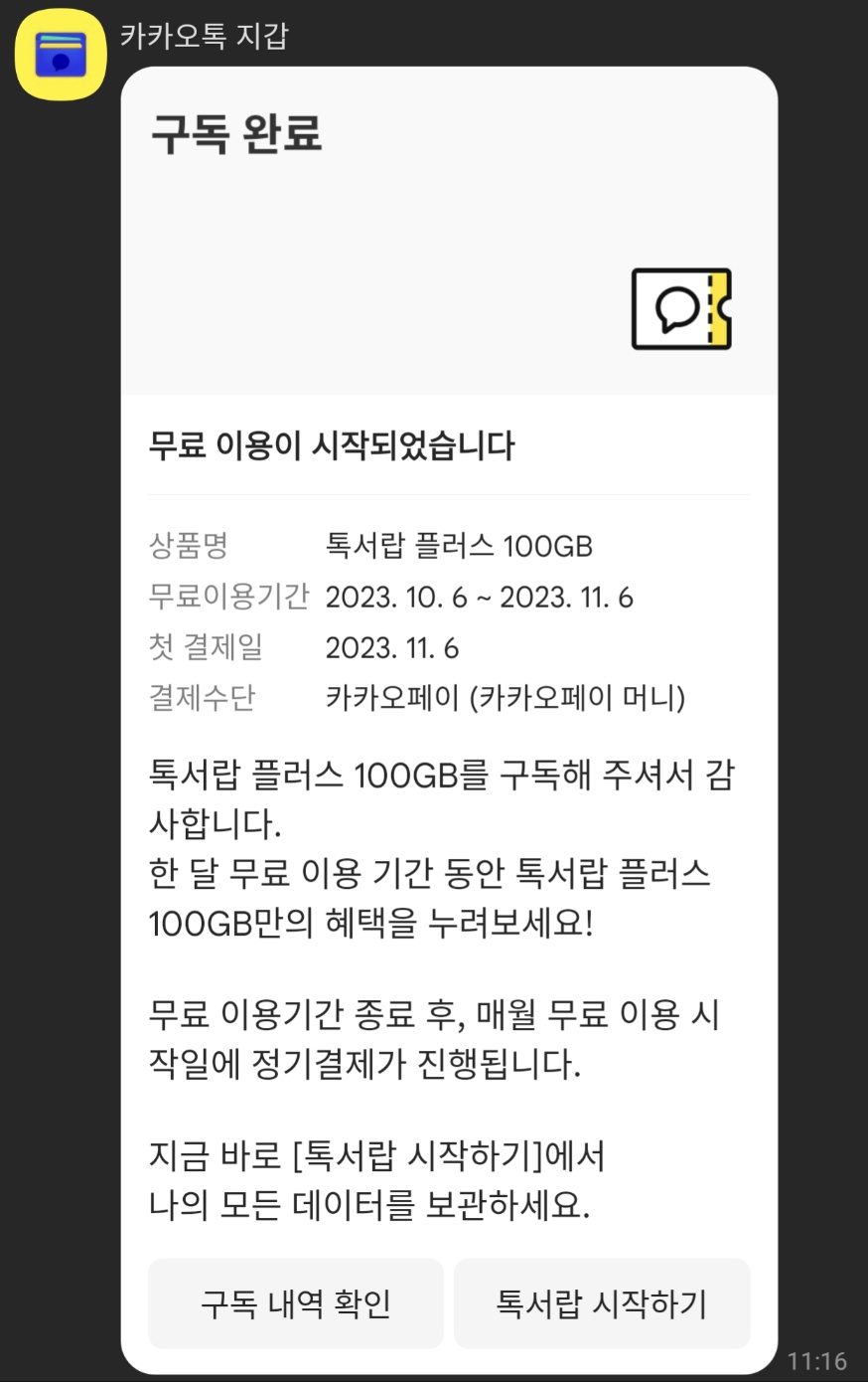이전 사진 불러오기가 안되는 것을 보고 톡서랍 플러스를 한 달간 구독했었습니다. 그런데 이전에 이미 만료된 사진 원본은 불러오기가 안 됐습니다. 그래서 그냥 한달 뒤에 해지할 생각으로 있었습니다.