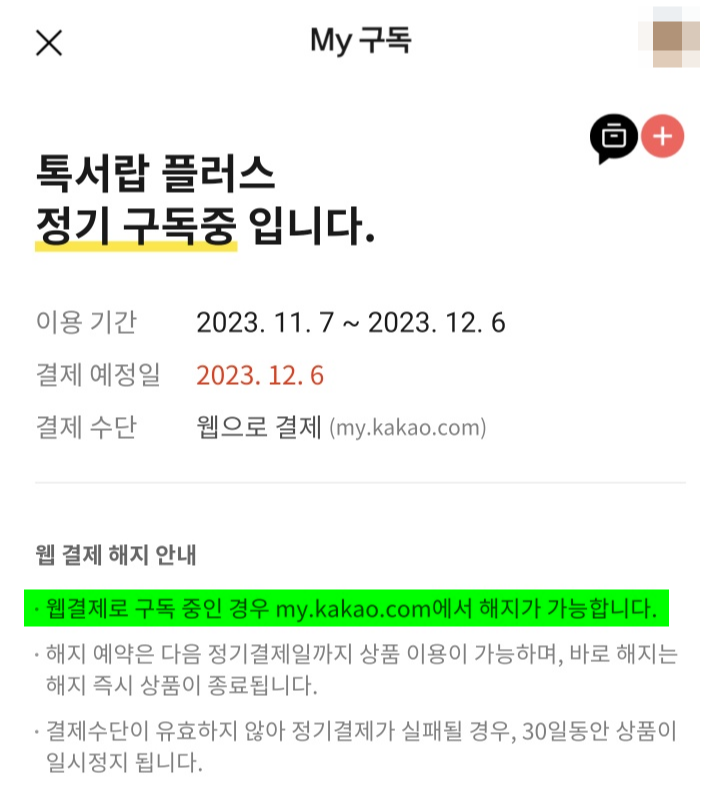 - My 구독 -> 구독중인 상품 -> 톡서랍 플러스 -> 해지하기