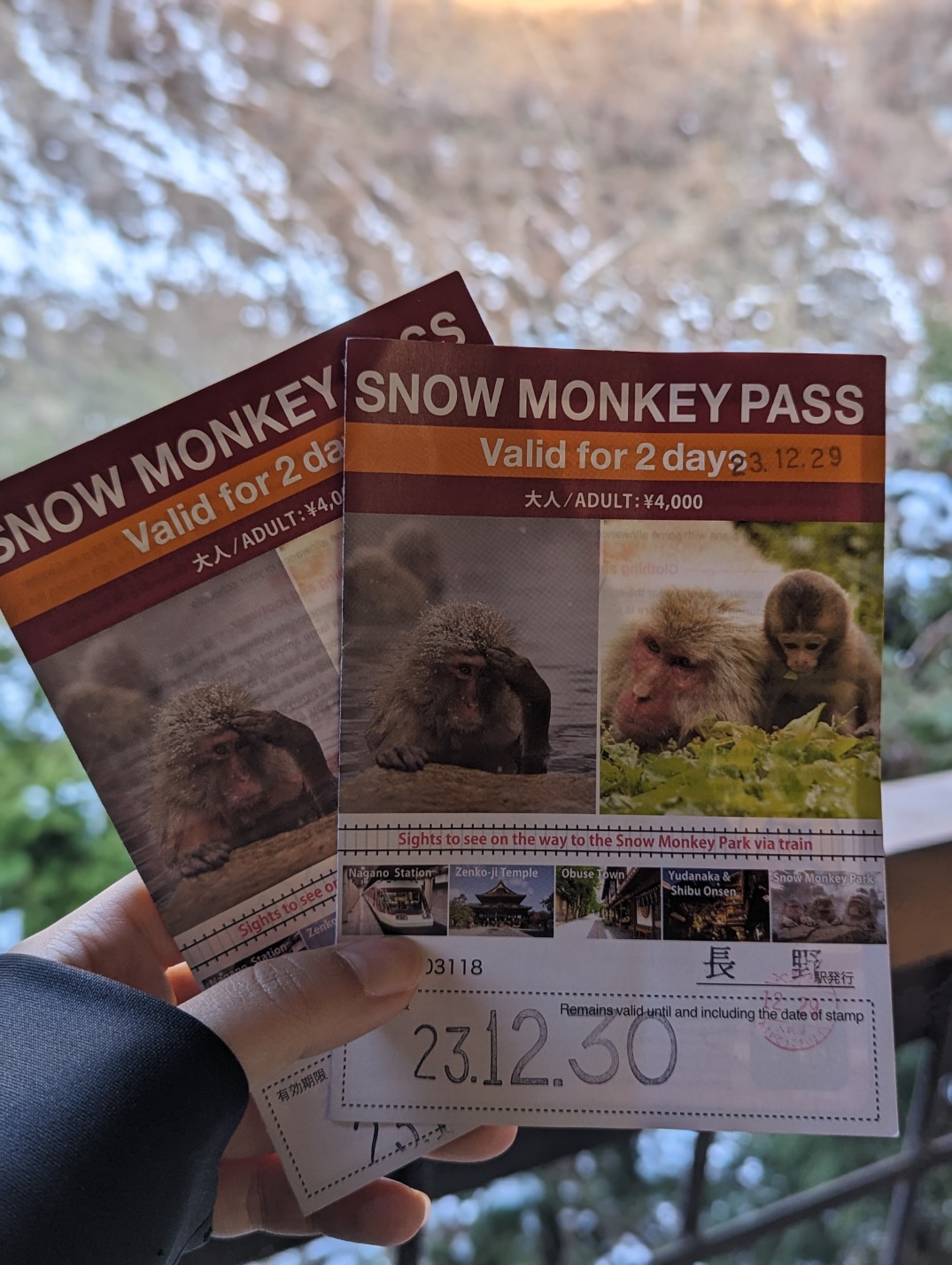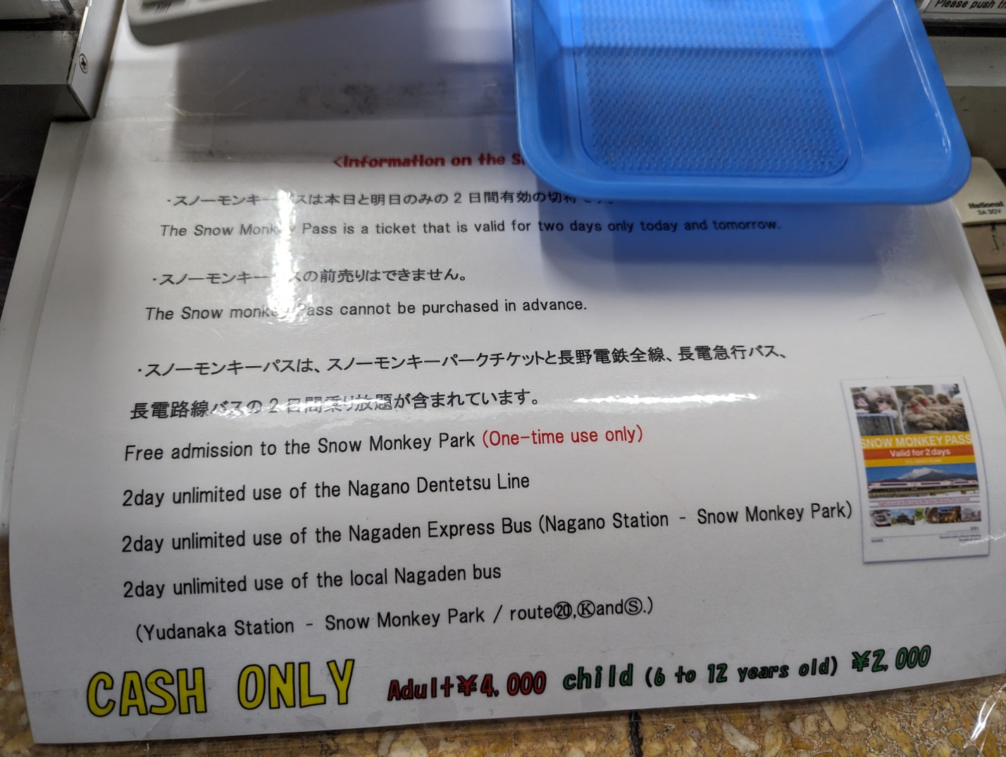 현장에서 구매하면 가격은 4000엔이고 현금만 가능합니다. 한국돈 4만원에 가까운 돈이다 보니 비싸다고 느껴질 수 있는데, 나가노역에서 지고쿠다니 야생 원숭이 공원 왕복 교통비와 공원 입장료를 합치면 딱 4000엔입니다. 그래서 나가노 전철을 한번이라도 더 이용하면 바로 이득이 되는 가격입니다. (ex. 젠코지까지 지하철을 타거나 오부세에 들리는 경우) 그리고 이 티켓이 있으면 지하철이나 버스 탈 때마다 표 살 필요 없고, 공원 입구에서도 입장권 살 필요 없이 바로 갈 수 있어서 아주 편리합니다.