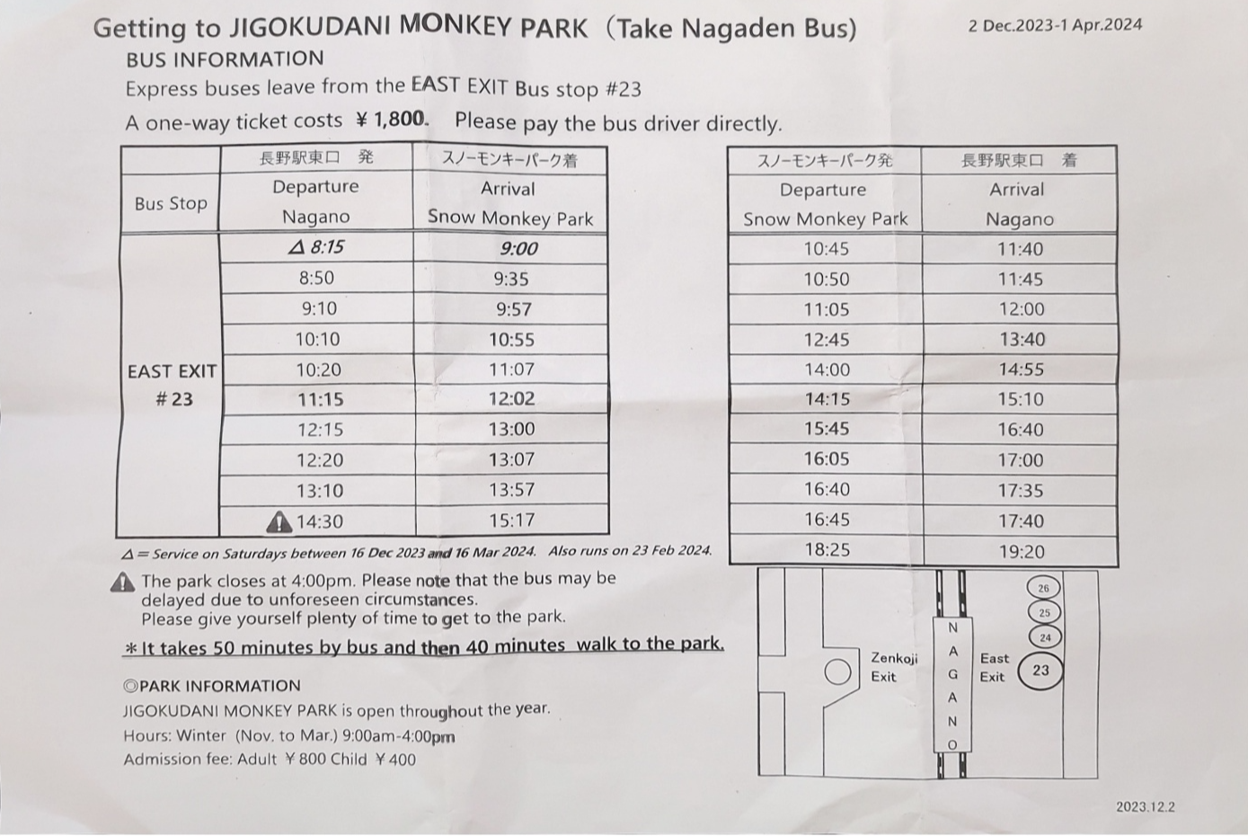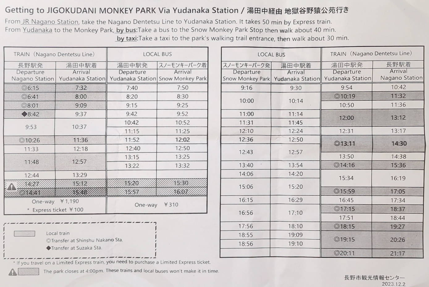 나가노 기차역에 있는 투어 인포메이션 부스에서 나가노 역에서 스노우 몽키 파크까지 가는 버스 시간표와 나가노 전철 시간표를 받았습니다. 저는 시부온천에서 1박 숙박을 하고 스노우 몽키 파크에 갔다가 돌아오는 일정이어서, 가는 길은 유다나카역까지 가는 전철을 이용했고 버스는 나가노역으로 복귀 할 때 이용했습니다.