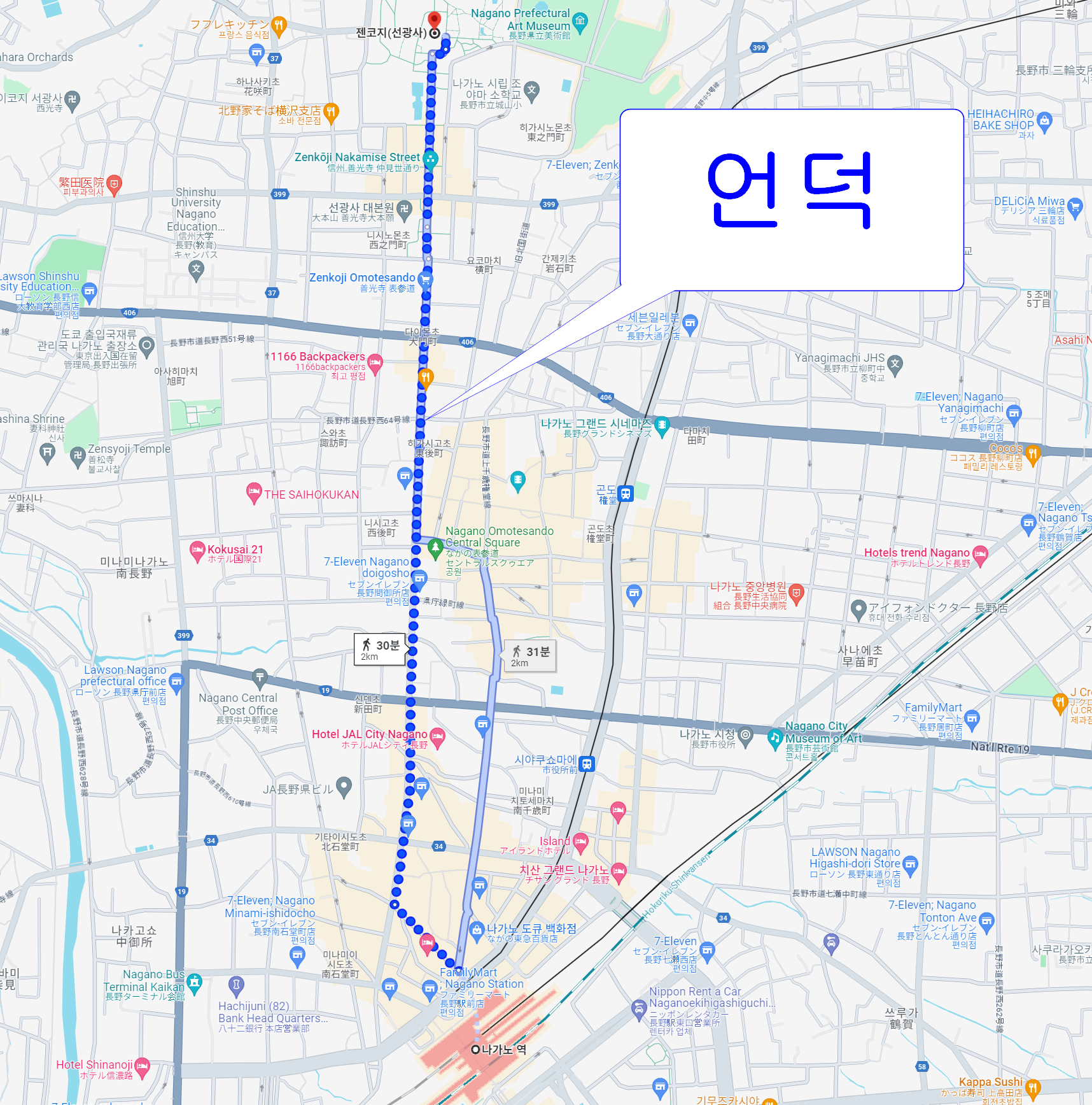 나가노역에서 젠코지까지 걸어갈 수는 있고 거리도 예쁘고 볼거리가 많아서 좋지만 가는 길이 언덕길입니다. 그래서 갈 때는 지하철로 젠코사지타역까지 가서 젠코지를 구경하고 다시 나가노역으로 돌아오는 것을 걸어서 복귀하기로 결정했습니다.