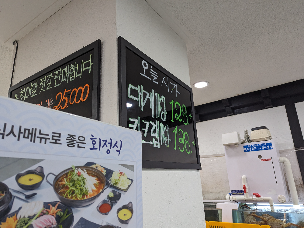 대게와 킹크랩은 시가로 가격이 정해져 있지는 않는데 가게에 시가를 크게 써두었습니다. 반면에 홍게와 랍스터는 정식 1인분이 각각 45000, 55000으로 정해져 있습니다.