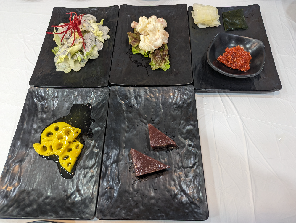 샐러드, 연근, 팥양갱이 먼저 나옵니다.