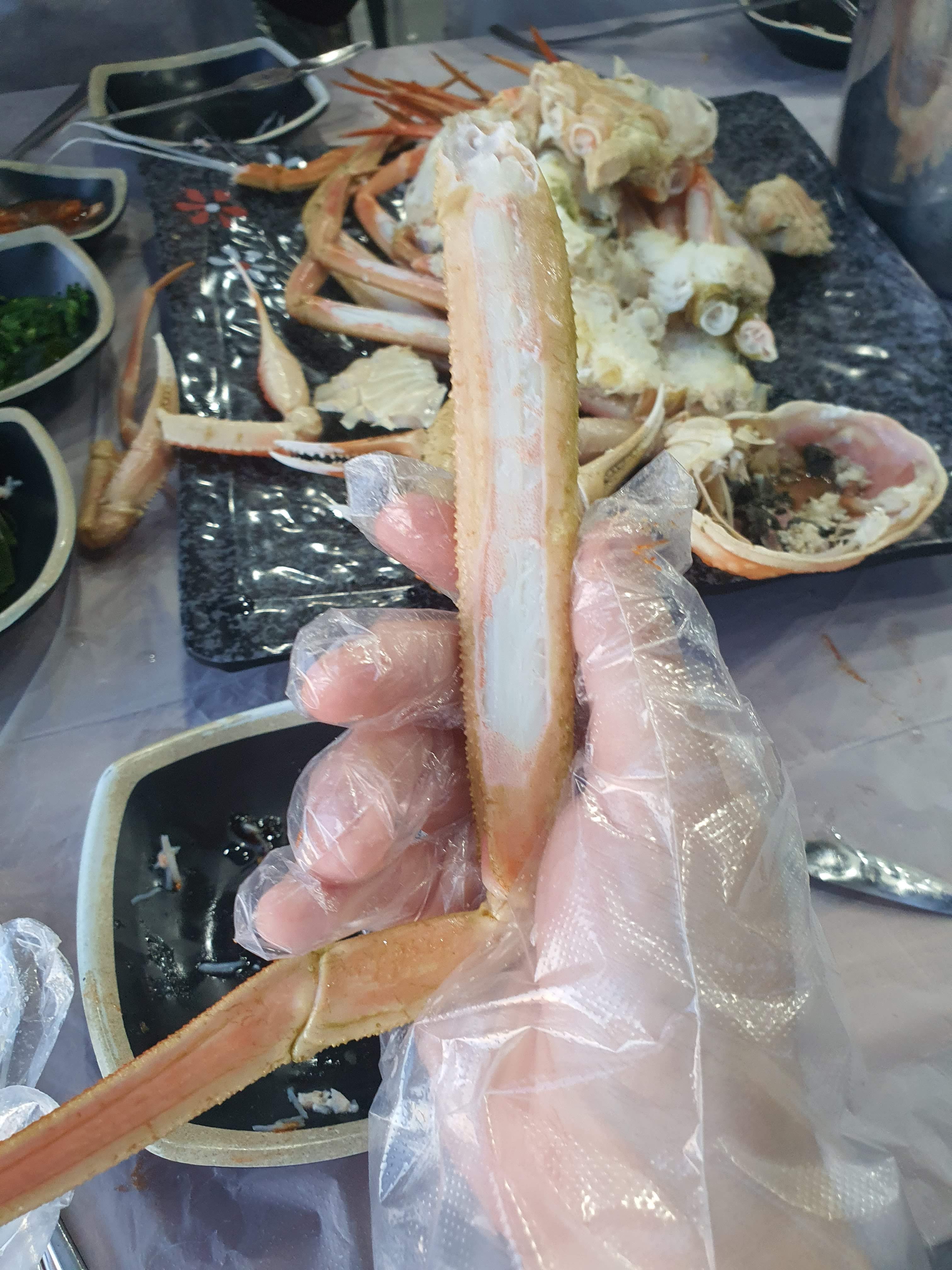 먼저 나온 반찬들을 먹다 보면 대게 두 마리가 잘 손질되어 나옵니다. 가위는 얘기해야 주고, 집게 마디 부분을 잘라 두 동강 내고 하나를 다른 한쪽에 밀어 넣어서 나옵니다.