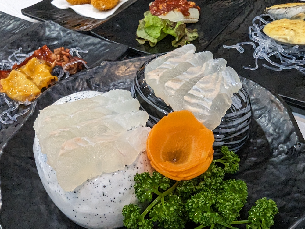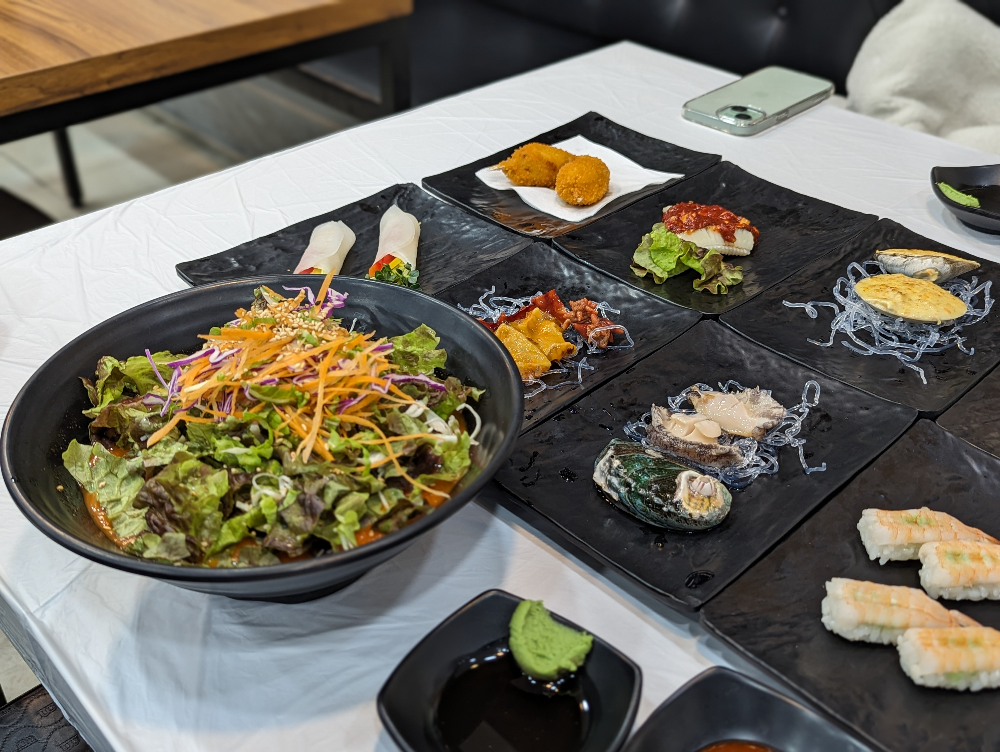 물회와 게 집게 튀김, 월남쌈, 치즈 조개구이, 새우초밥이 나옵니다. 나머지는 그냥 평범했고 물회가 맛있었습니다.