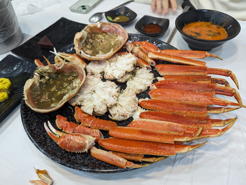내가 정말 입맛에 맞는 음식으로 배부르게 먹고 싶어 갈 만한 곳이 아닌데, 해산물이 깔끔하게 나오니까 누군가를 대접하는 자리로 간다? 이건 아닌 것 같습니다. 대게 먹으면 두 명에서 20만 원 넘게 써야 하는데, 다시 간다면 대게보다는 랍스타를 먹고 오겠습니다.