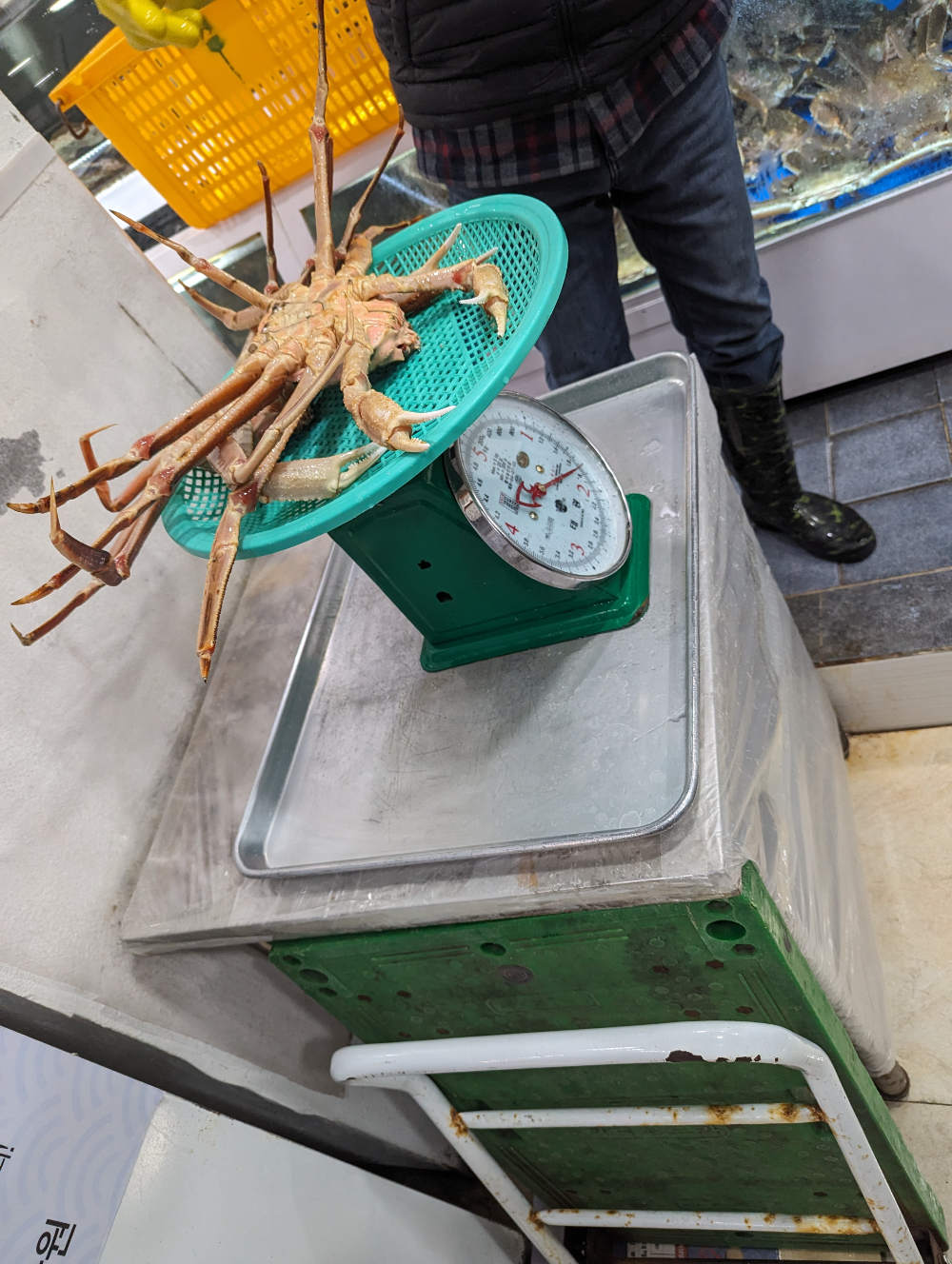 대게는 마리당 가격이 아닌 1kg당 가격이어서 대게 사이즈를 어느 정도 고를 수 있습니다. 그리고 원하면 무게 측정하는 모습을 직접 확인시켜주기도 합니다. 저희는 2마리에 1.7kg 정도 하는 대게를 골랐습니다.