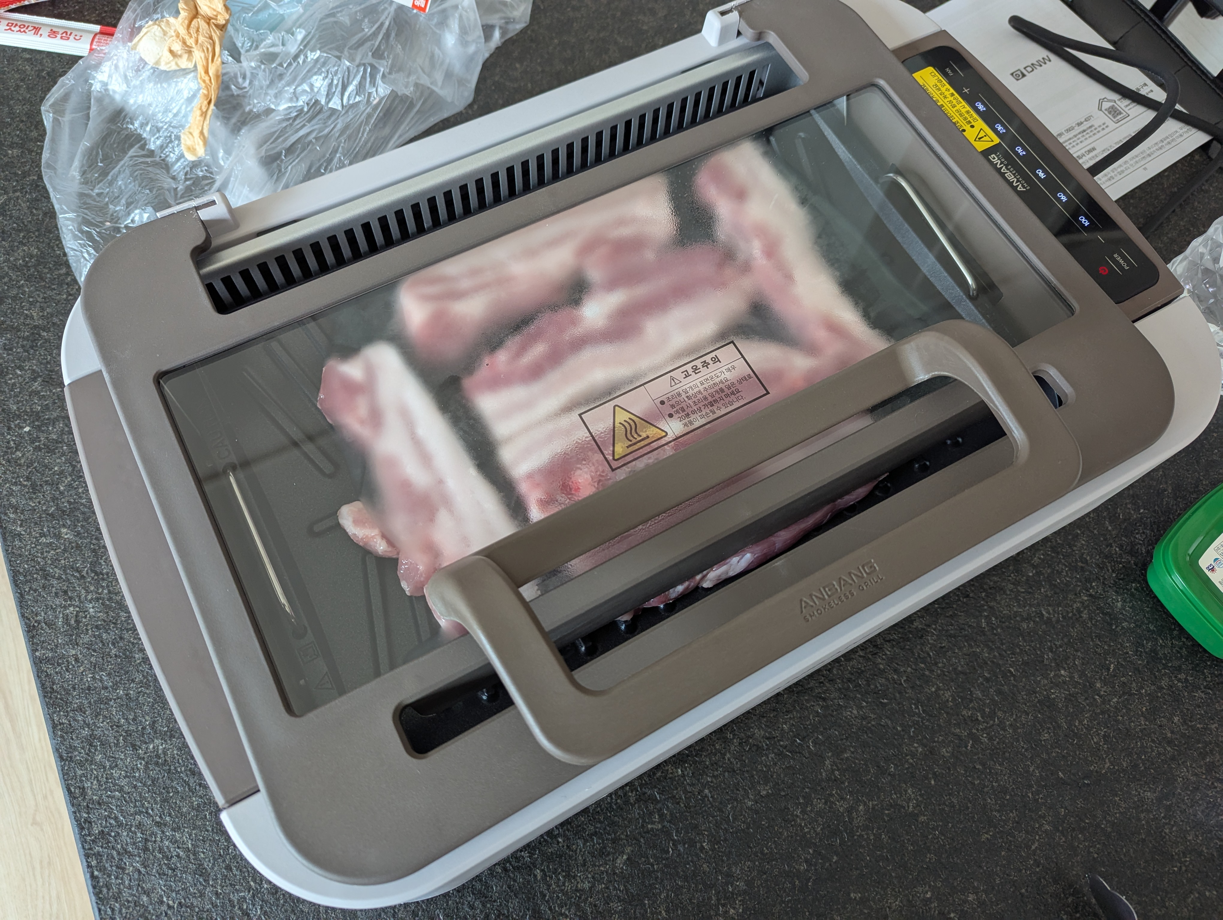 본가에서 안방그릴 구버전을 사용했는데, 고기를 구울 때나 전 요리를 할 때 쓰기 좋아보여서 저도 집에서 편하게 고기를 구워 먹으려고 구매했습니다. 마침 회사 복지몰에 연말까지 사용해야하는 금액이 남아있어 이 제품을 구매해 보았습니다. 우선 1회 사용해본 입장에서, 제품 가격이 좀 비싸기는 하지만 집에서 고기를 자주 구워먹는다면 충분히 살만한 제품이라고 느껴졌습니다.