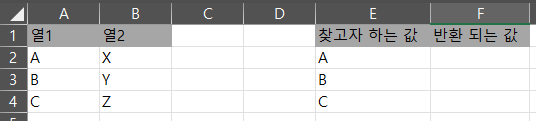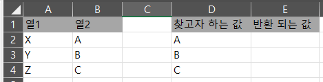 이전에 설명했듯이 이렇게 A,B,C가 반환하려는 값 보다 오른쪽에 있으면 vlookup을 쓸 수가 없어집니다.
