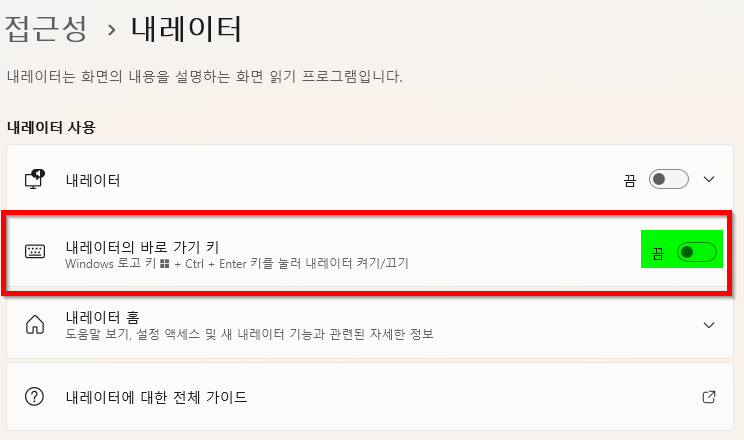 내레이터의 바로 가기 키를 끔으로 바꾸면 컨트롤 + 윈도우 + 엔터 키를 눌러도 내레이터가 실행되지 않습니다.