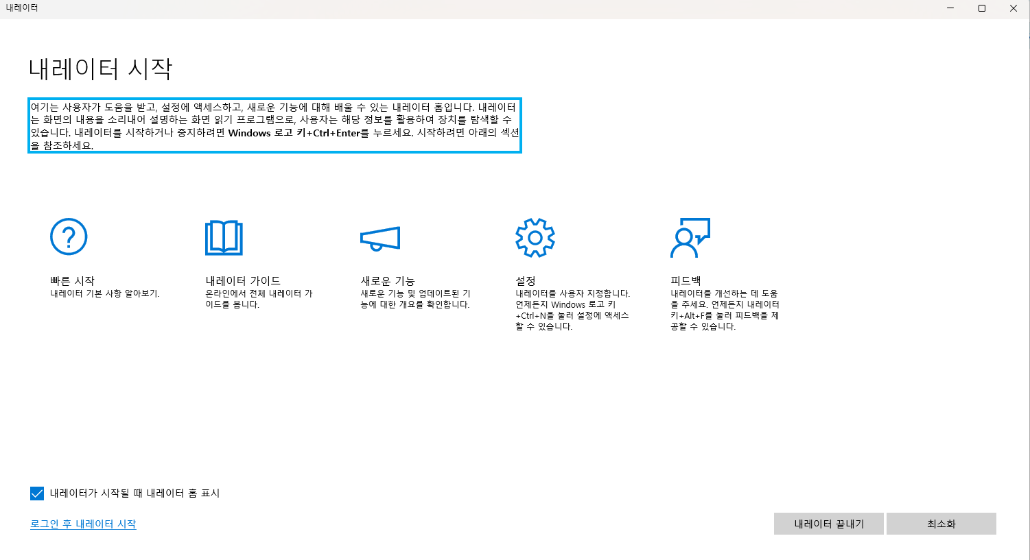 내레이터가 실행되었을 때 우측 하단에 있는 '내레이터 끝내기'를 누르면 바로 꺼지는데, 이것보다 애초에 활성화가 안되게끔 하고 싶었습니다.