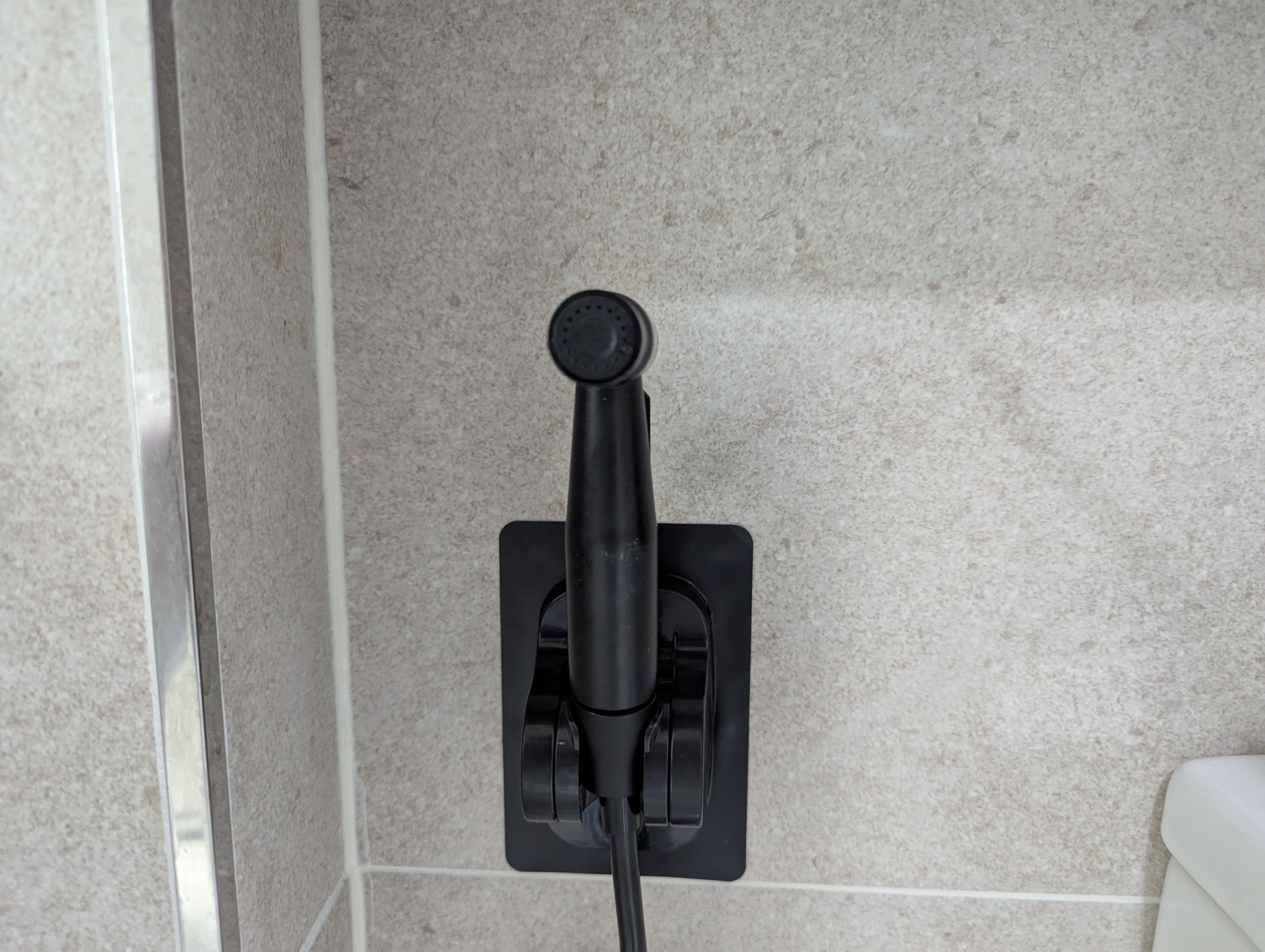 호스 반대쪽에 헤드를 샤워헤드 연결하듯이 돌려서 장착해 주면 되고, 거치대는 적당한 곳 벽에 붙이면 됩니다.