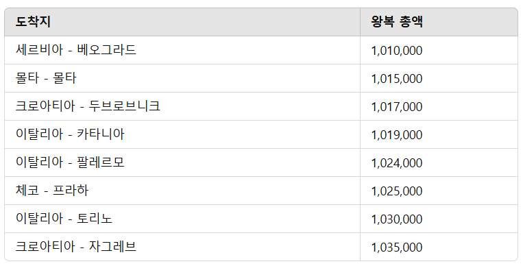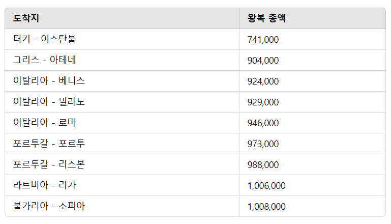 모든 금액은 최저가 기준이고 세금과 유류비가 포함된 왕복 총액 금액입니다.