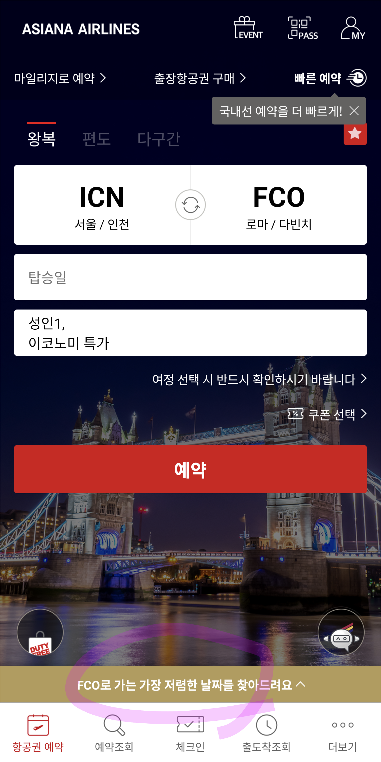 아시아나항공 앱 실행 → 하단 '가장 저렴한 날짜를 찾아드려요' 배너 위로 쓱! 끌어올리기 ⏫