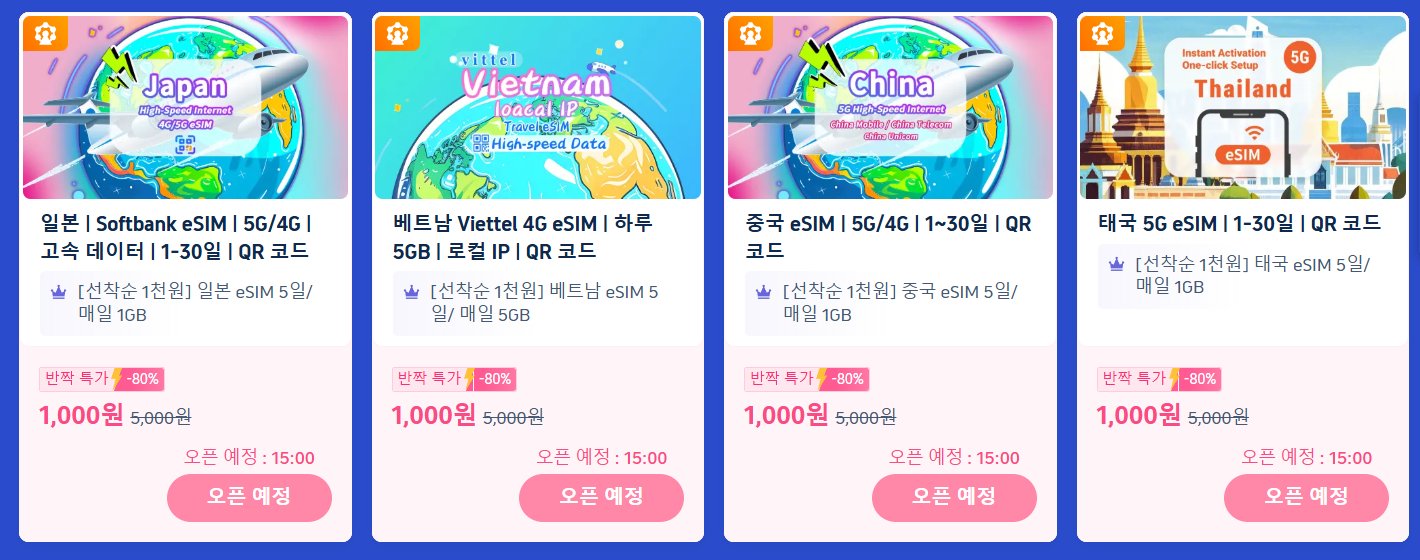 - 동남아(싱가포르/말레이시아/태국/인도네시아 등) 하루 1GB 5일 1000원