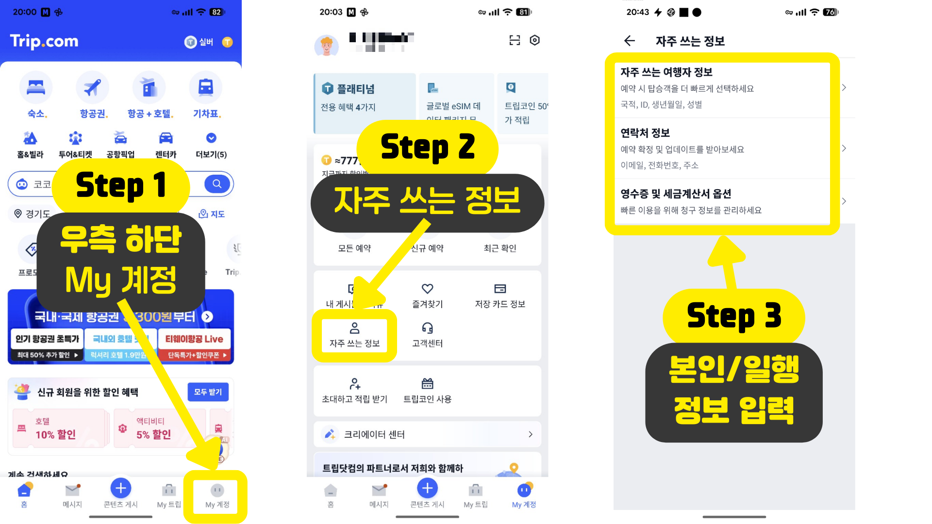 [My 계정] - [자주 쓰는 정보] - 자주 쓰는 여행자 정보에서 탑승자 정보를 미리 등록해두세요.