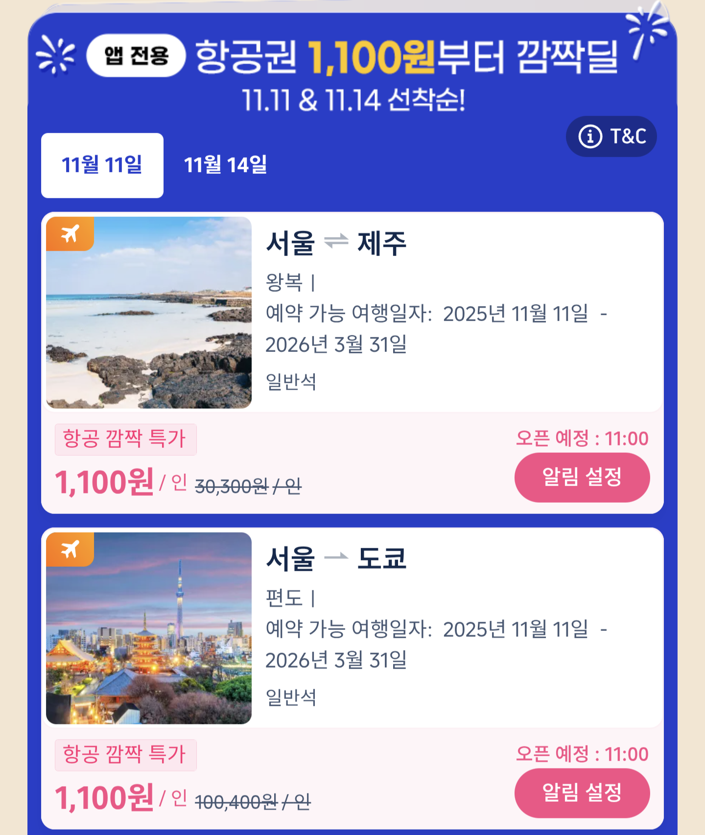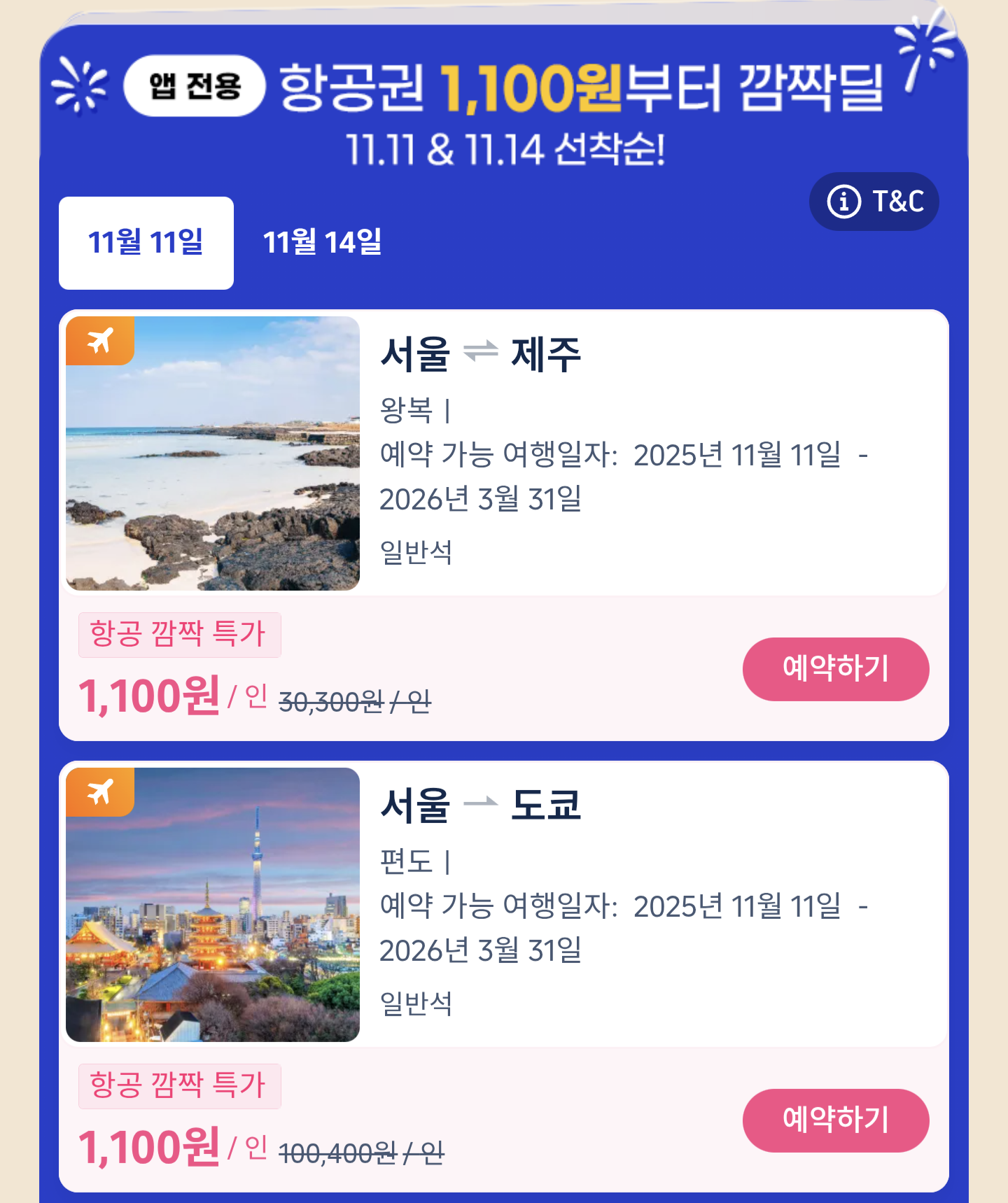 | 🔥 항공권 깜짝딜 | 서울-제주/도쿄 편도 1,100원, 상하이/오사카 편도 11,000원 등 초특가 항공권 |